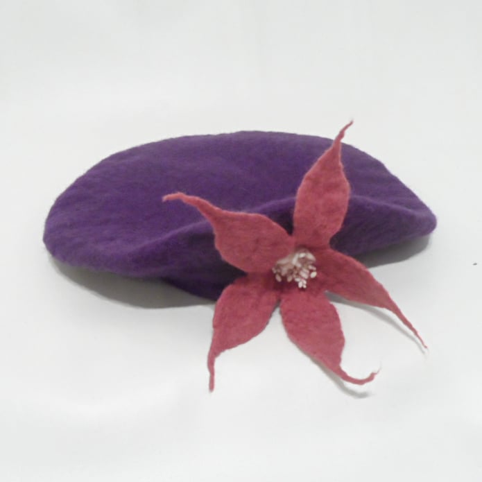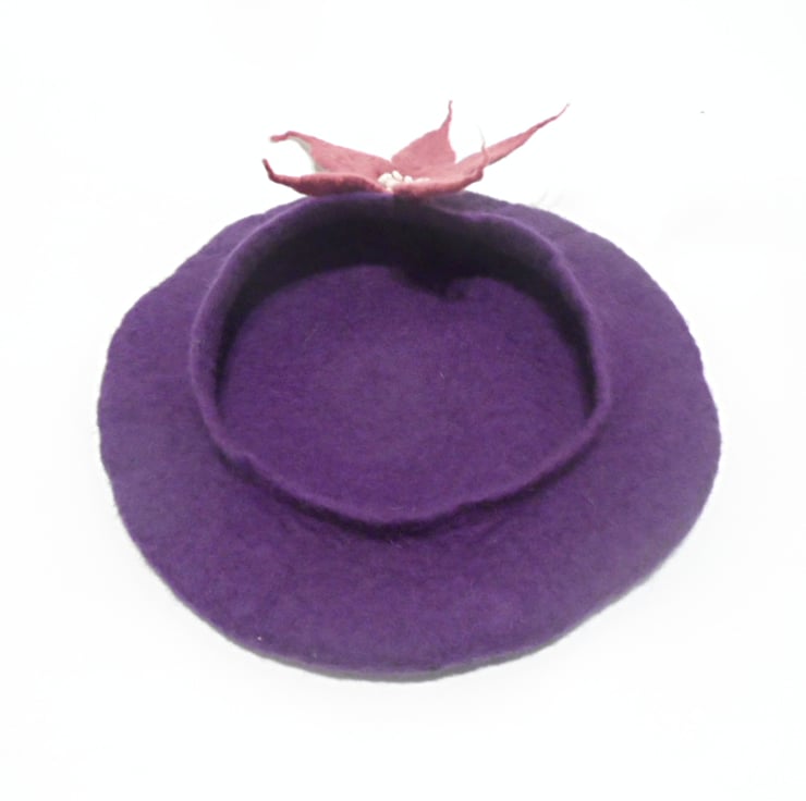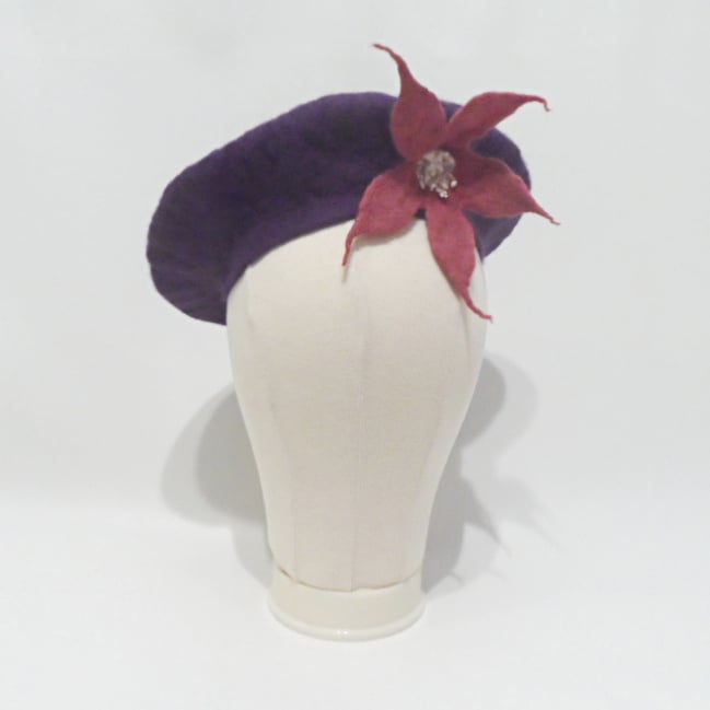 A beautiful 100% wool beret style hat, hand felted from a deep purple shade of New Zealand Perendale wool. Measuring approximately 27cm in diameter the opening measures approximately 54cm in circumference.