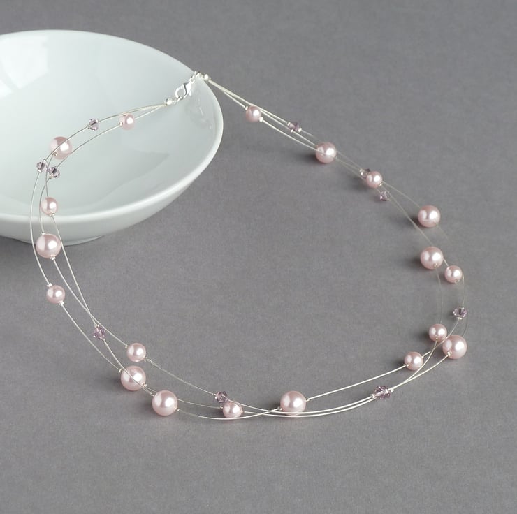 I have teamed sparkling crystals with blush pink glass pearls to create this floating pearl necklace. The light pink hues used make these necklaces a perfect bridal party gift for bridesmaids in a pale pink themed wedding.