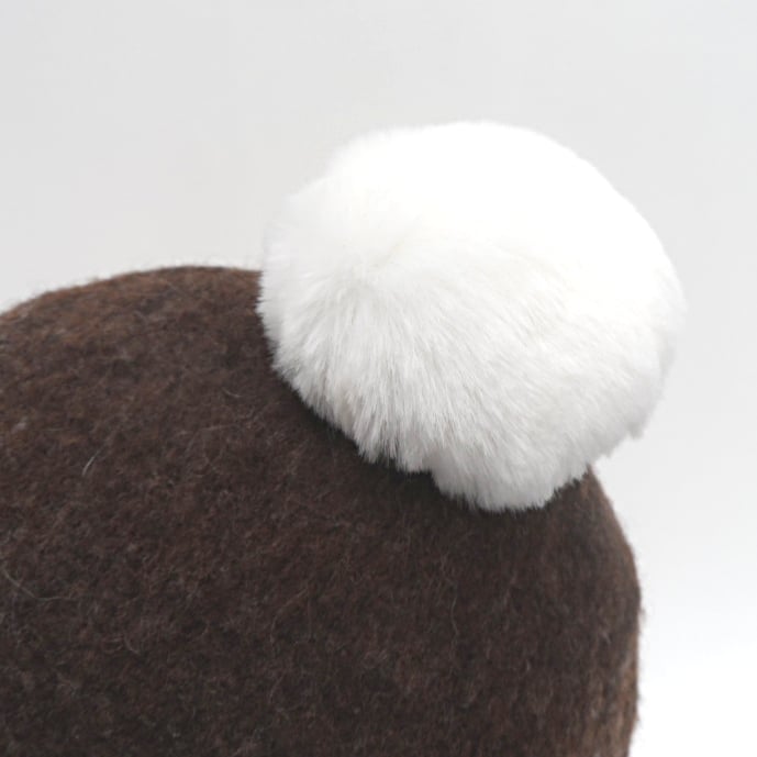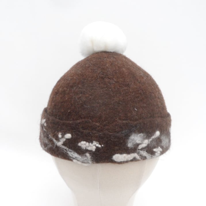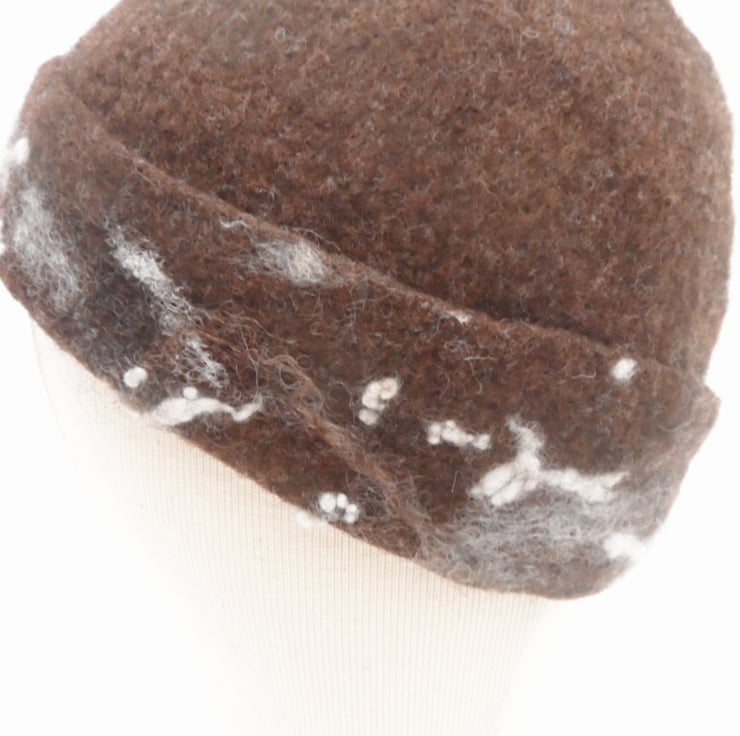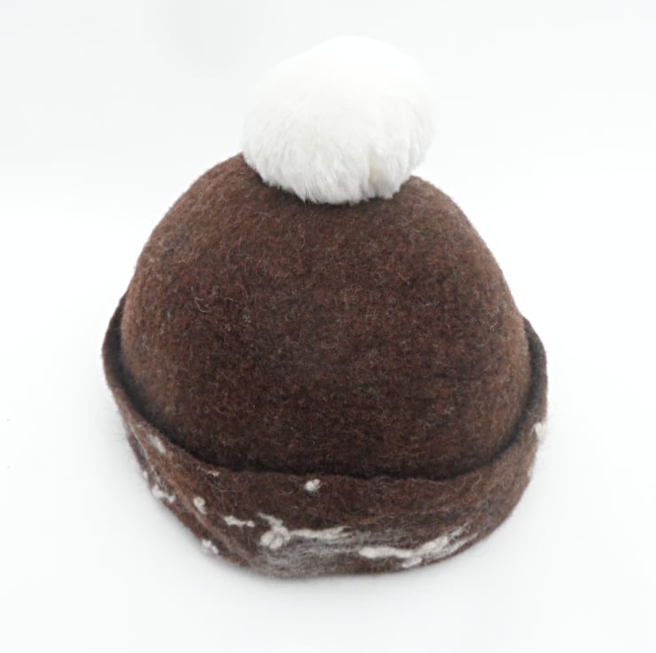 This beanie hat has been hand felted using 100% natural brown merino wool. Additional wool and silk fibres have been added around the band in white and brown shades as decoration. A large white faux fur pom pom has been added to the top. The resulting hat is super warm and snug. The hat has been made to fit a 22" (56cm) head.
