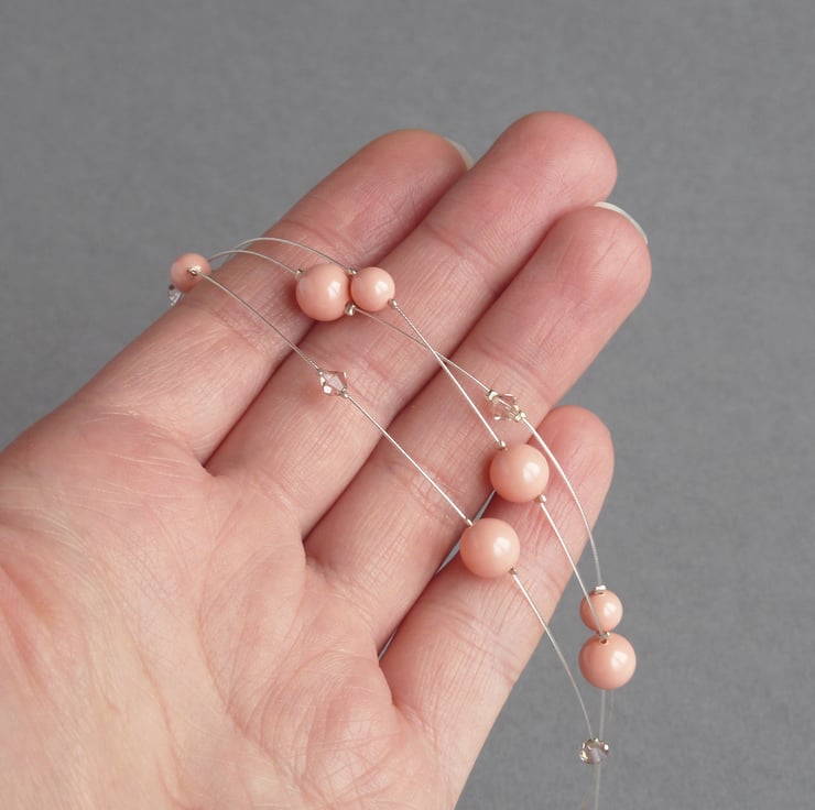 Coral Pink Floating Pearl Necklace - Peach Wedding Jewellery - Bridesmaid Gifts