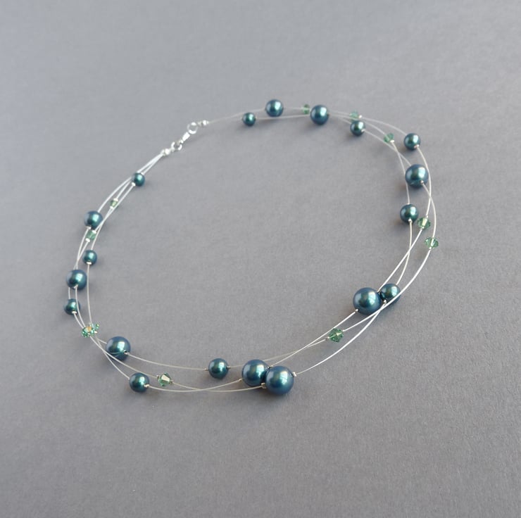 To create this dark green floating pearl necklace, I have used a mix of lustrous glass pearls and shimmering crystals. This peacock green necklace would make a perfect bridal party gift for bridesmaids in an aquamarine themed wedding.