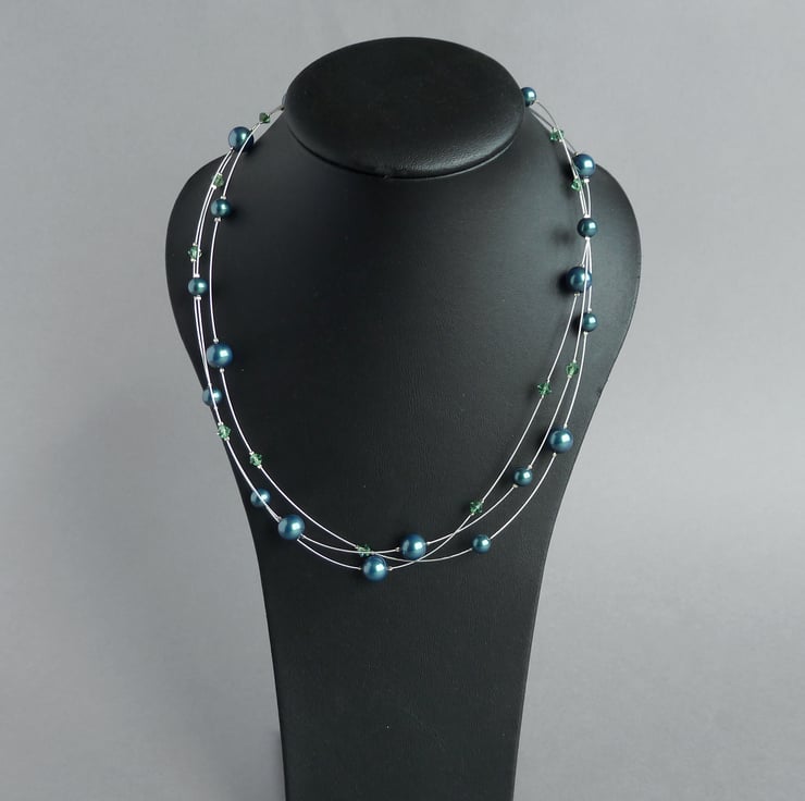 Dark Green Floating Pearl Necklace - Petrol Blue Bridesmaids Jewellery - Gifts
