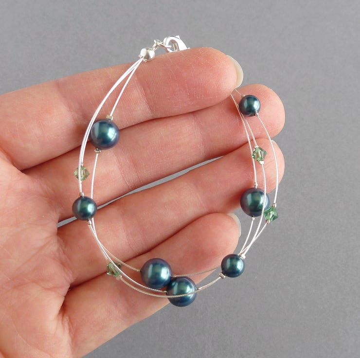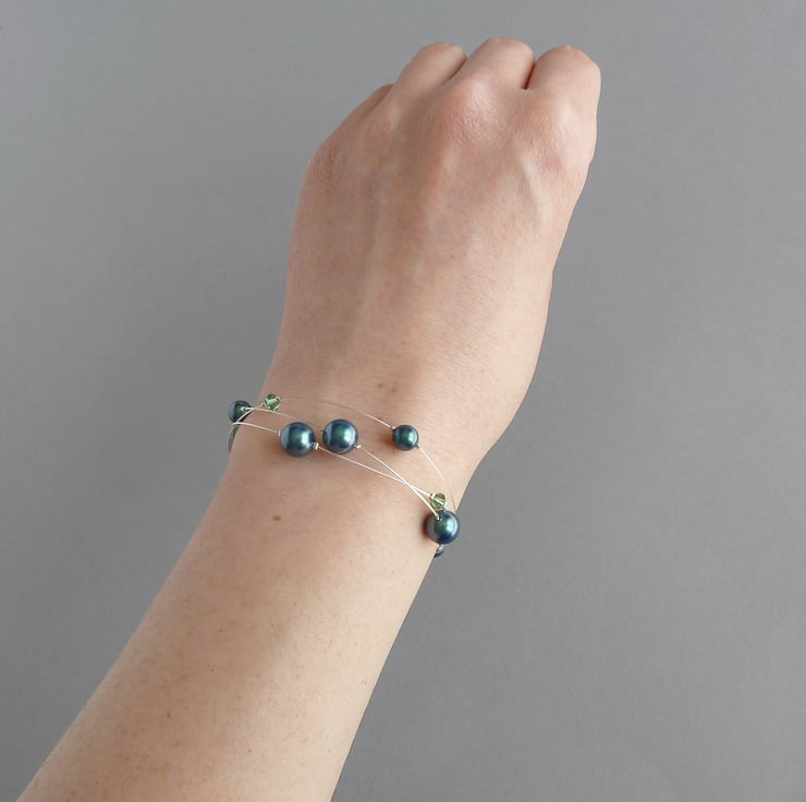 I have used a mix of sparkling crystals and lustrous, glass pearls to create this dark green floating pearl bracelet. Its peacock green colour would make this multi-strand bracelet an elegant accessory for a bridesmaid in a petrol blue themed wedding.