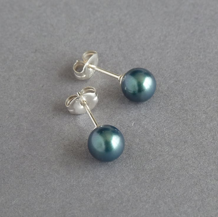 The emerald pearl studs have been created by setting 6mm glass pearls onto Sterling silver posts. The silver posts have been fitted with butterfly back to ensure they stay in place.