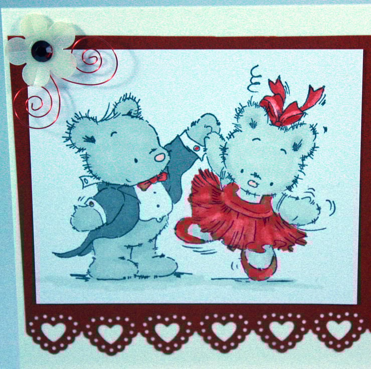A6 anniversary card featuring a hand stamped and coloured image of two cute dancing bears, together with a ribbon bow, gem and wire embellishments.