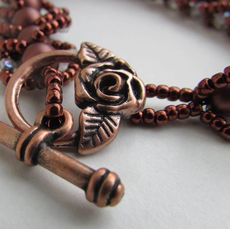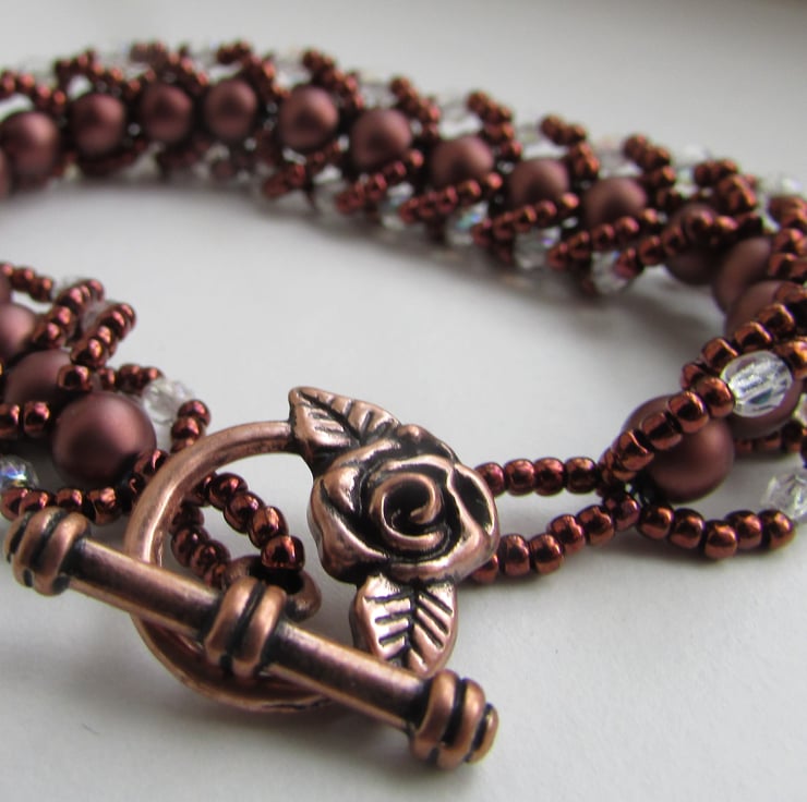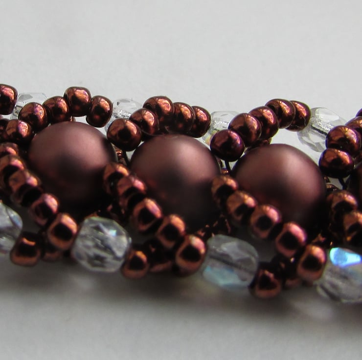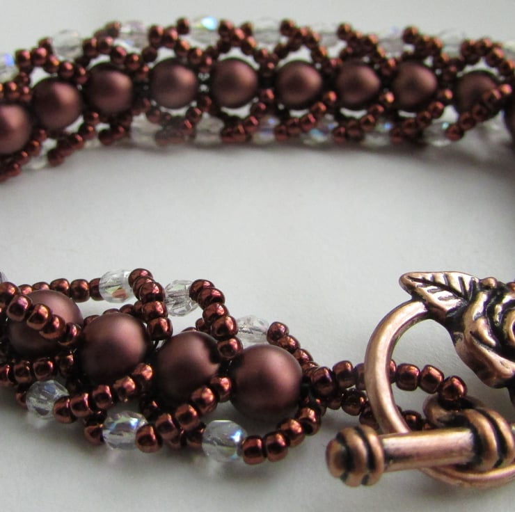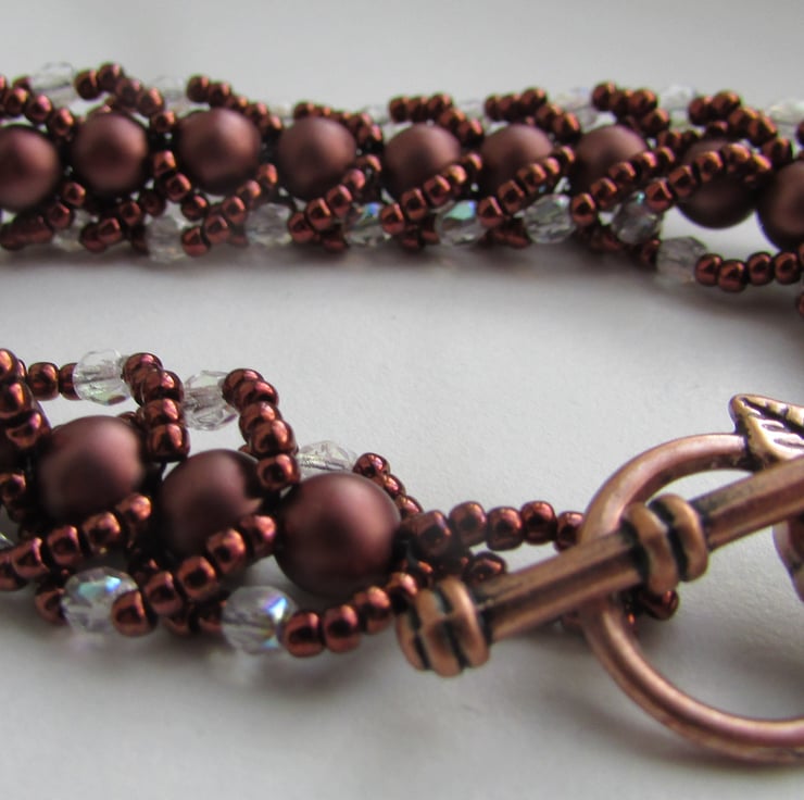 Beautiful bronze coloured bracelet made with 6mm Preciosa glass pearls, bronze coloured size 11 seed beads and 3mm Czech fire polished beads, which give a lovely sparkle, finished with a copper coloured flower toggle clasp for easy fastening.
