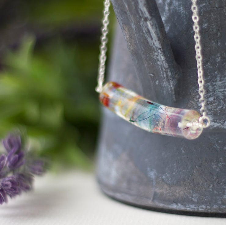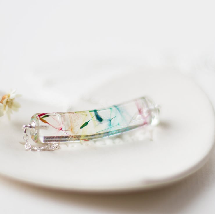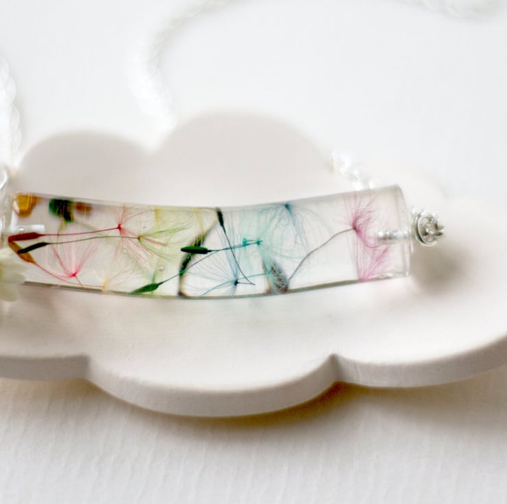 This lovely necklace is filled with real dandelion wishes in a rainbow of colours... each wish is precious and perfect and has been lovingly coloured and placed by hand to form a rainbow, from red all the way through to pink and purple.