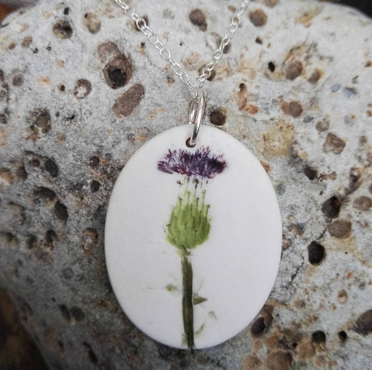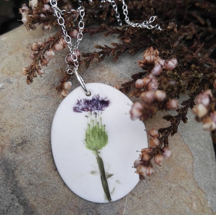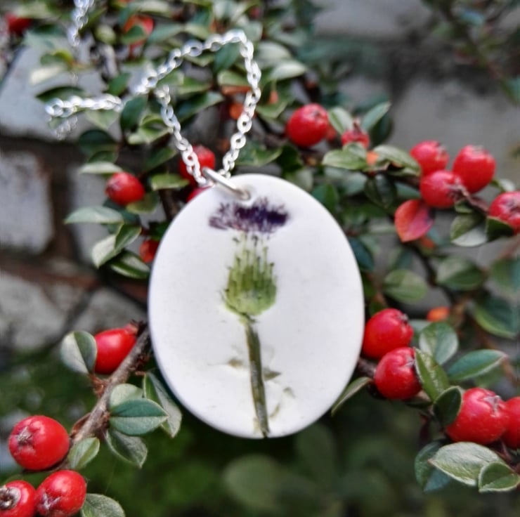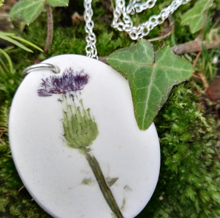 i love nature and walking in the country side i pick up samples and use them as inspiration, like this thistle pendant made from the actual impression of a thistle then hand painted.