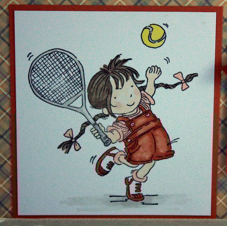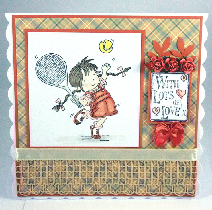 Square scalloped greetings card, suitable for birthdays, congratulations, thank you, new job or even retirement. The card features a hand stamped and coloured image of a little girl playing tennis and is finished with paper roses, a satin ribbon bow and a raffia and satin ribbon tennis net along the bottom of the card.