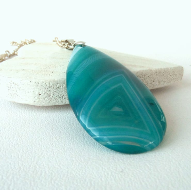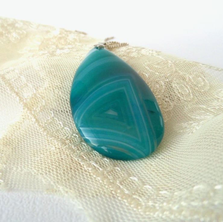 A gorgeous banded agate pendant that hangs from a silver coloured bail on a silver plated necklace chain to create this stunning gemstone necklace.