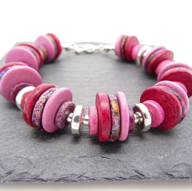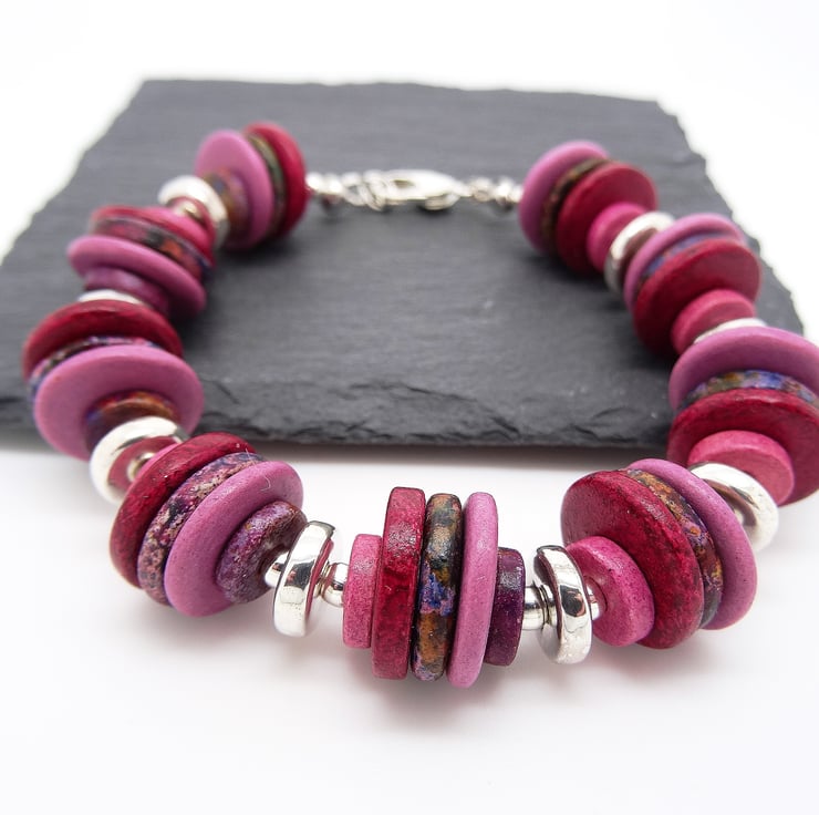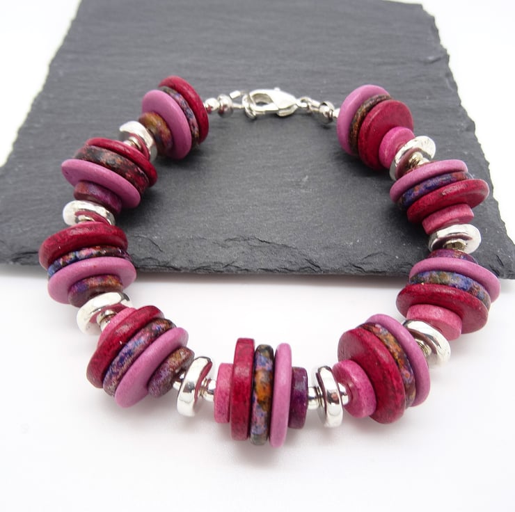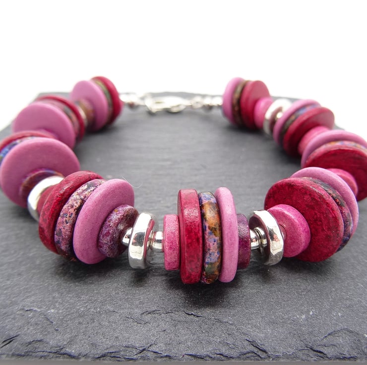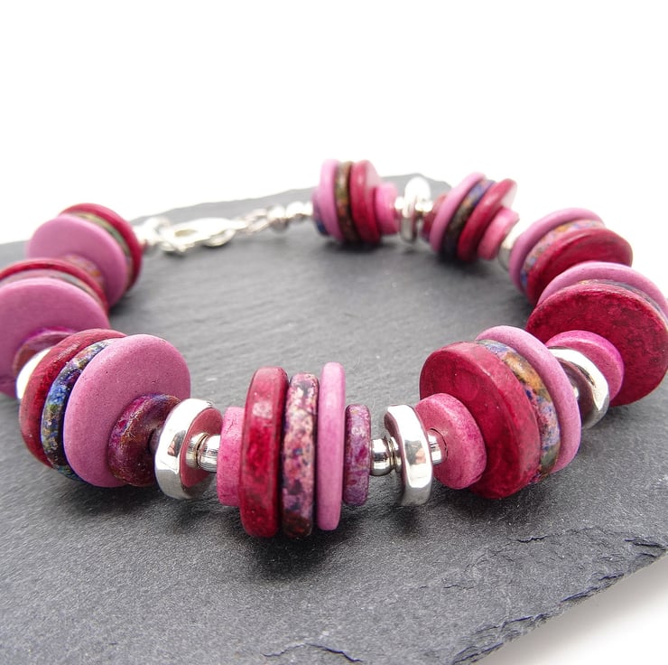 This is a lovely bracelet made with Mykonos Greek Ceramic Washers in purple, lavender, heather and silver. The washers are in two sizes 12mm and 5mm and are interspersed with silver spacer beads. The bracelet measures 7.3/4" (almost 20cm) and closes with a large silver plated lobster clasp for ease of fastening. As all of the items in my shop are unique, individual pieces made by myself, this is the bracelet you will receive. It will arrive gift wrapped in tissue paper and a organza bag.