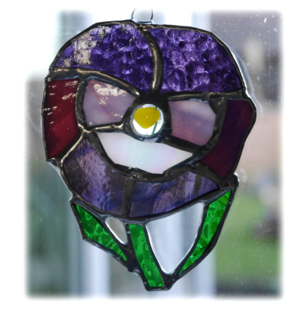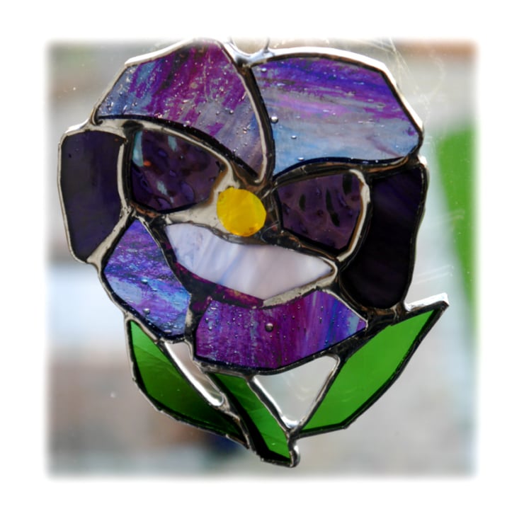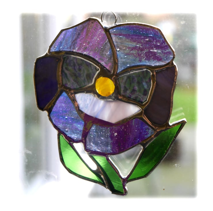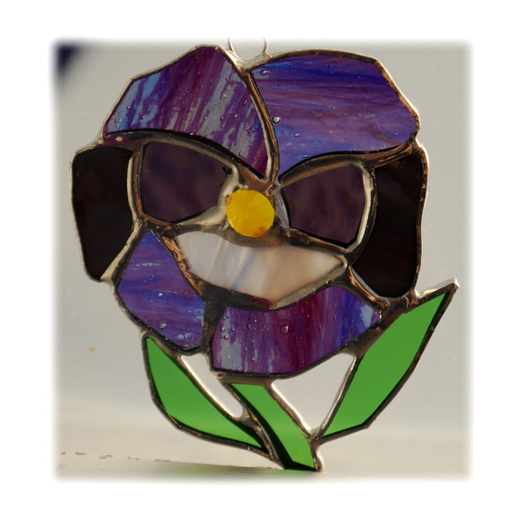I've used streaky , iridescent and textured glass in different shades of purple to make it extra pretty and pansylike. The leaves are bright green and it has a little fused yellow glass nugget at the centre which I made in my kiln.