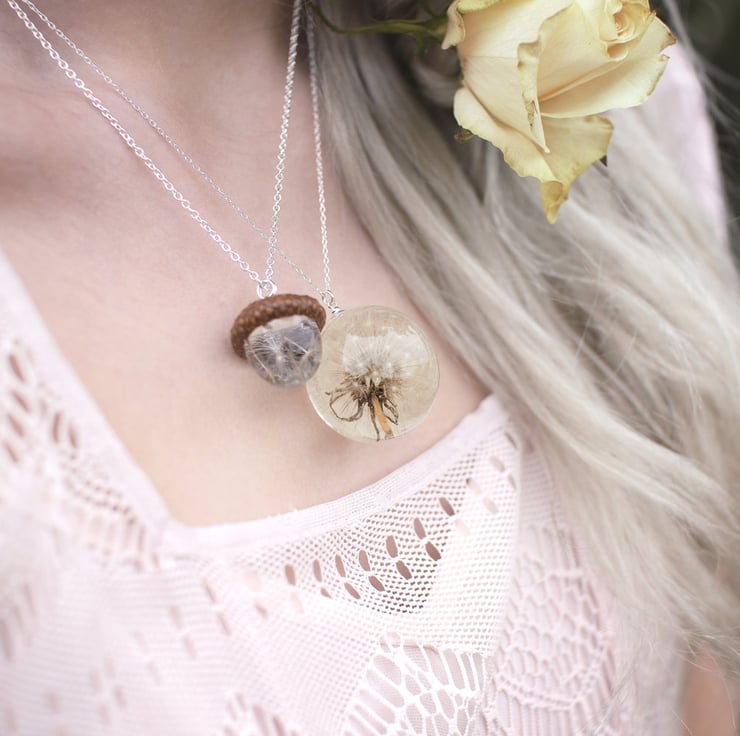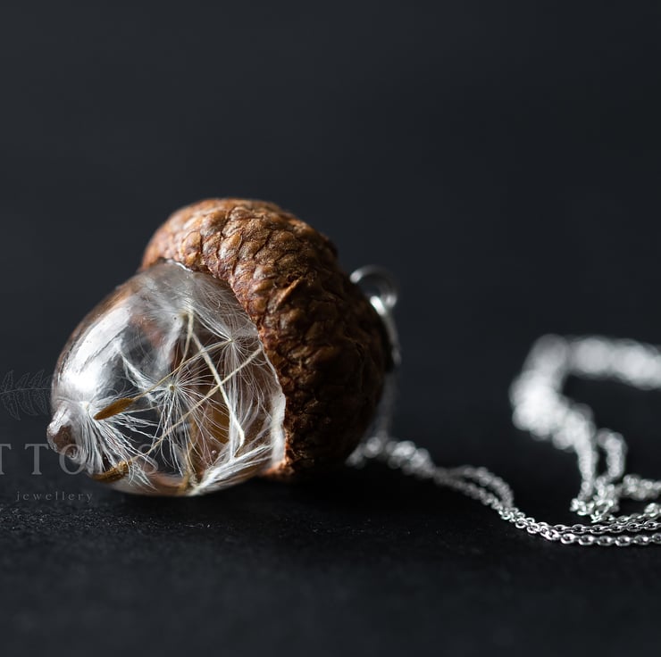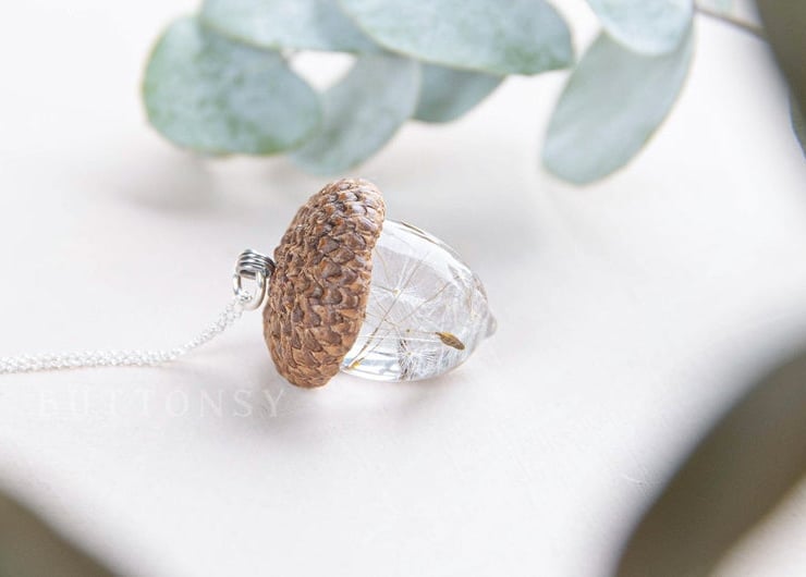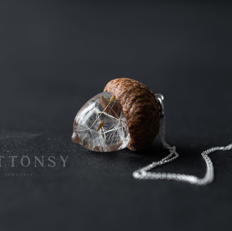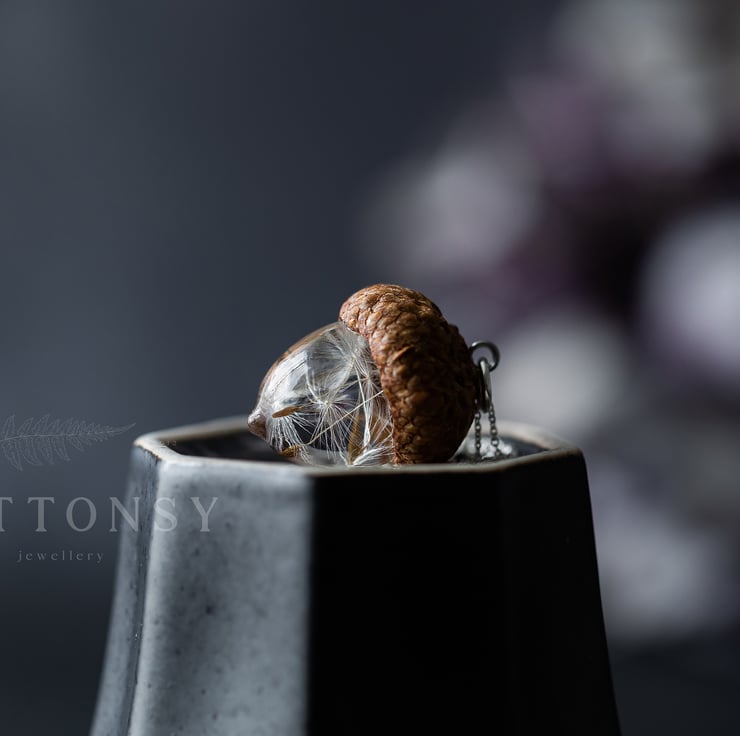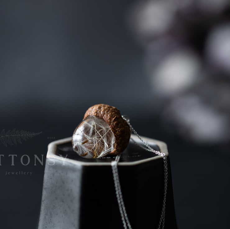 This beautiful necklace is a Buttonsy signature piece - a handmade acorn, filled with real dandelion wishes and a real acorn cap collected from the base of a gorgeous old Oak tree... each wish is precious and perfect and has been lovingly placed by hand.