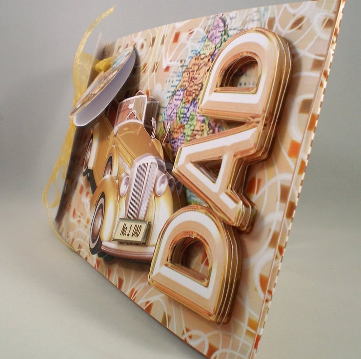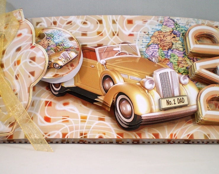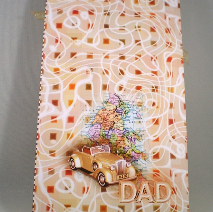 The design is of an old car which is 3D and is for a dad ,I will use gold ribbon or cord .If you have a preference please let me know at checkout