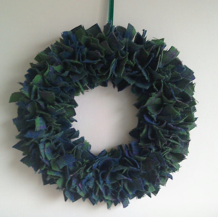 This lovely Harris Tweed wreath is made from a gorgeous green and blue check with a pretty lilacy pink stripe as part of the check. The colours conjure up the Scottish landscape and this is a truly beautiful Harris Tweed. The wreath is backed with navy velvet and comes with a green velvet ribbon loop hanger.