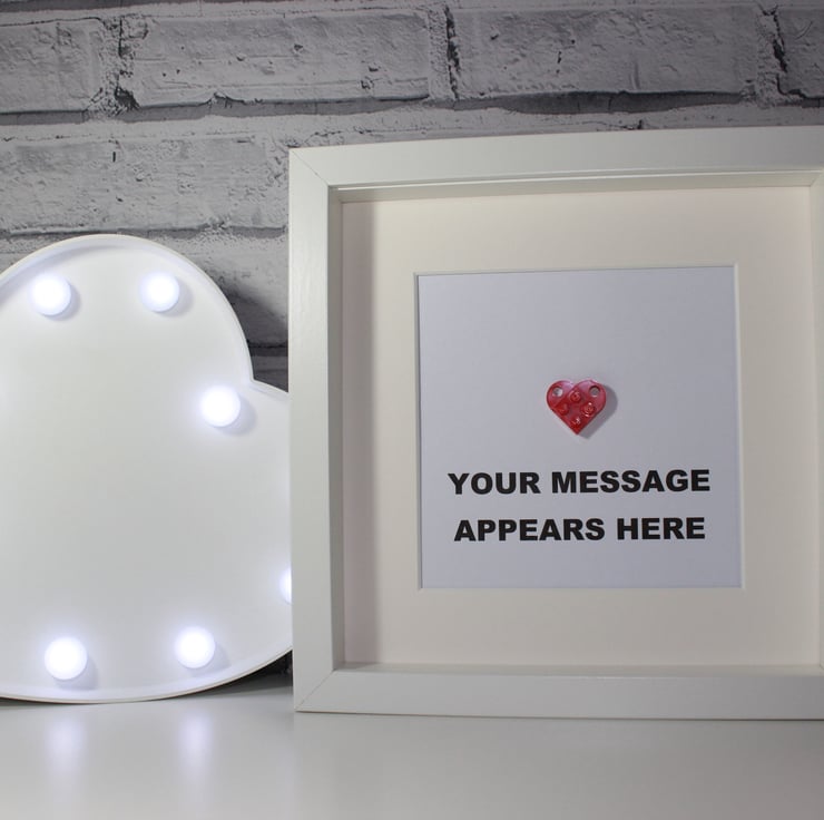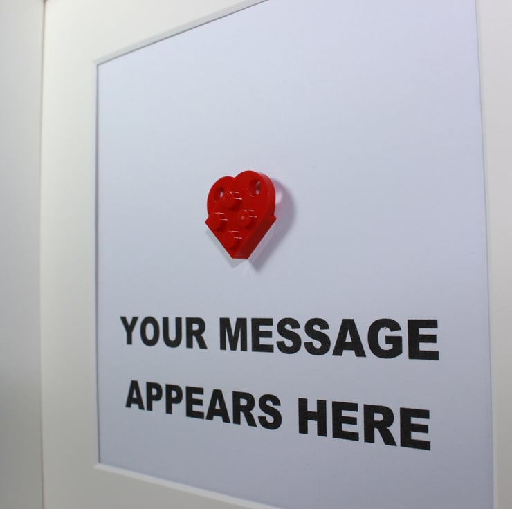We will mount and frame one of our fabulous Lego hearts and add your own personal message underneath.