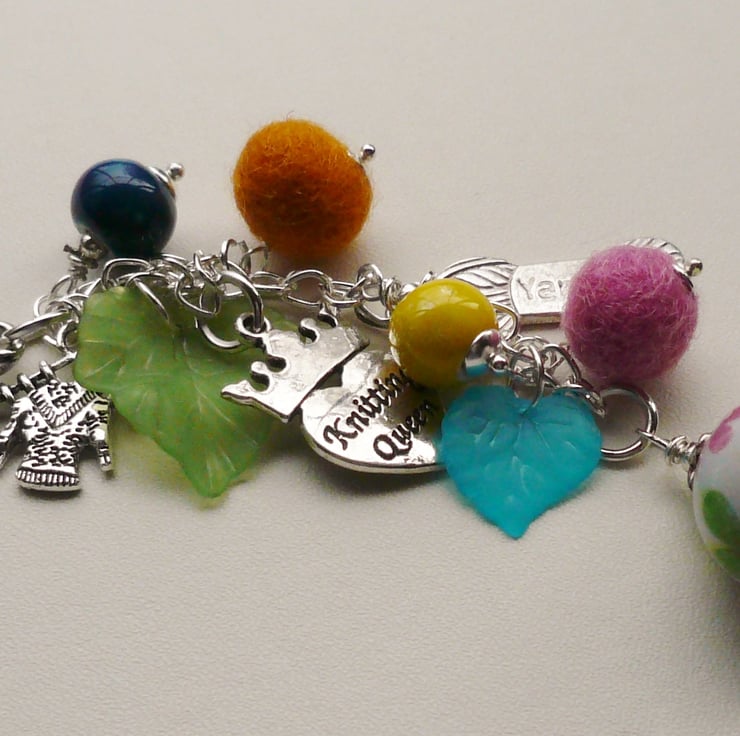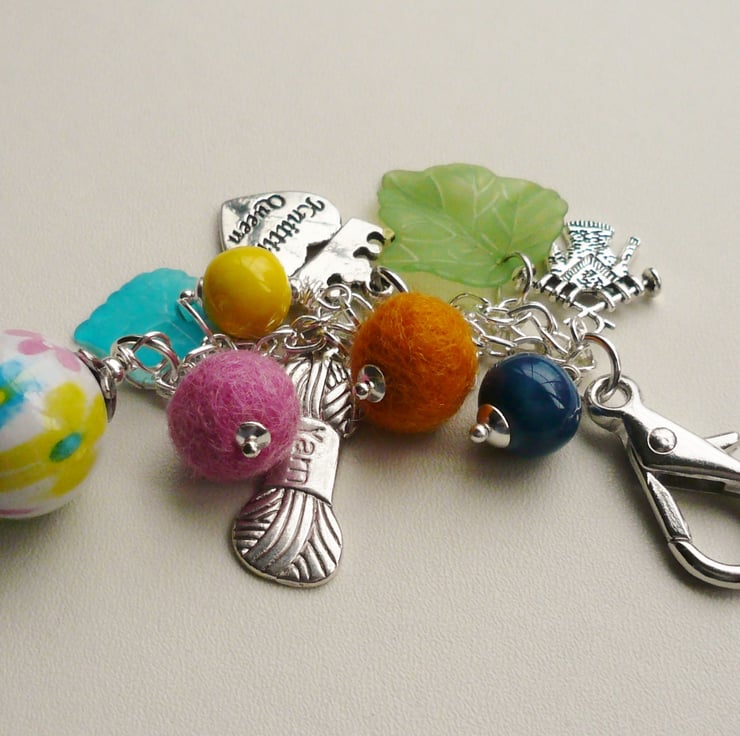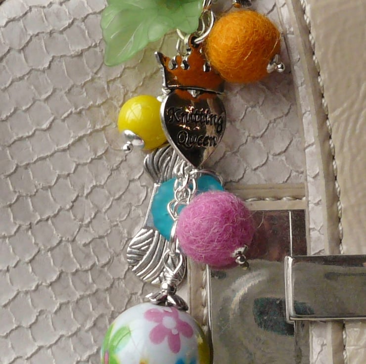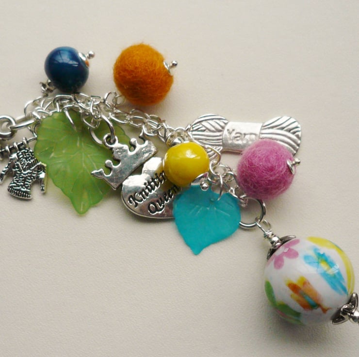 This pretty knitting themed handbag charm consists of a 20mm round pastel painted flower acrylic bead which hangs below and has been teamed with co-ordinating 10mm round felt beads in pastel pink and orange, 10mm round blue and yellow ceramic beads, 15mm and 25mm blue and green lucite leaves and finished off with three knitting themed Tibetan silver charms. All attached to a silver plated 30mm trigger clasp and chain. Total length incl clasp is approx 13cm.