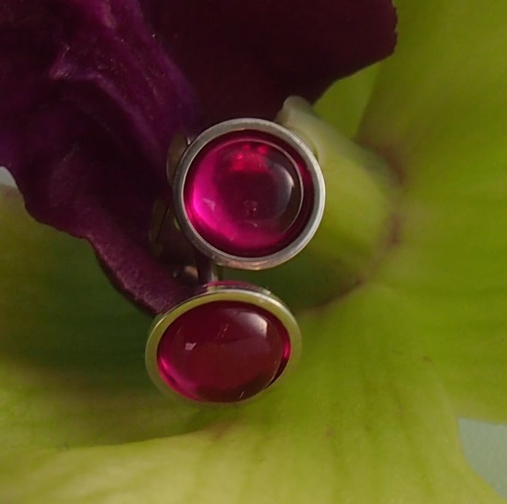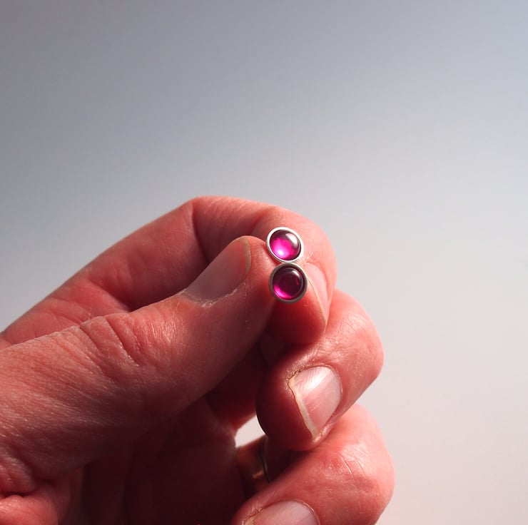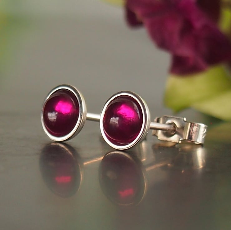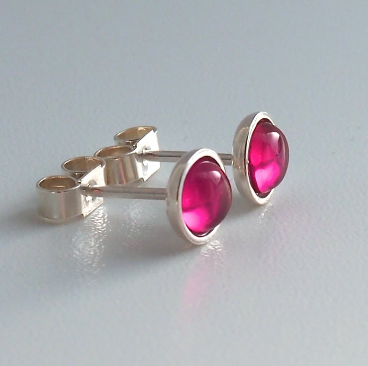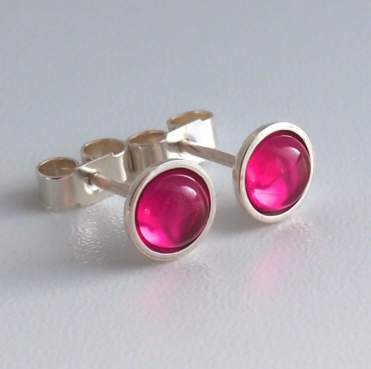 Gorgeous deep pink 5mm ruby cabachons are mounted on a sterling silver setting with a stud and butterfly fastening. This is lab created material which is identical to natural material chemically and structurally but is very affordable.