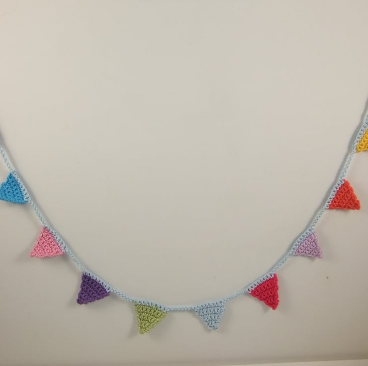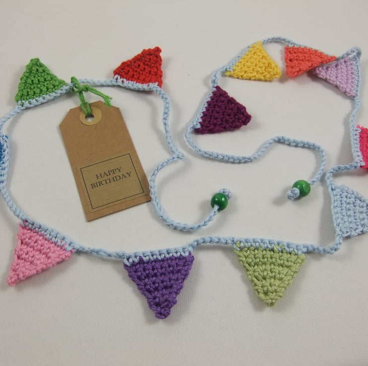 A cross between a keepsake and a gift, this sky blue string of 12 flags in cheerful colours is perfect for celebrating a special occasion! There is a tag at one end with the printed message, 'Happy Birthday!' although I am happy to exchange this for one with a message of your choice. The garland which measures just over 1 m in length, is crocheted in 100% cotton with a wooden bead at each end for ease of tying.