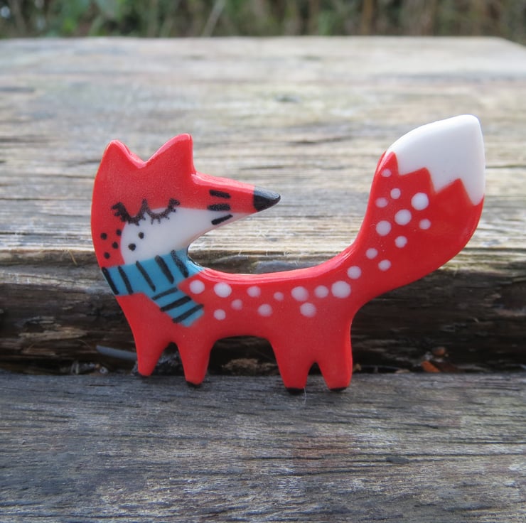 Handmade porcelain red fox brooch 3.5 x 4.5 cm.Mr.Fox is handcut from porcelain clay,biscuit fired,hand painted and glaze fired.There is a silver plated brooch pin securely glued on the back.