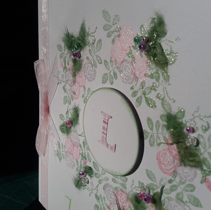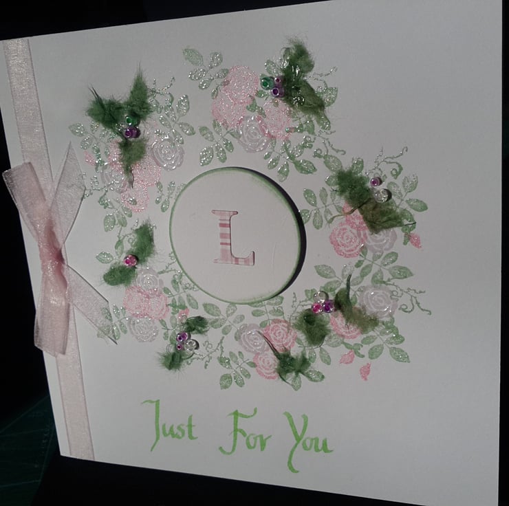 A completely handmade and uniquely designed card. Consisting of pristine white quality card which has a design of roses and foliage stamped and clear embossed. Further embellished with green mulberry paper and glass beads in clear, pink and lilac. Finished off with pale pink organza ribbon and bow and Just For You handwritten in green ink