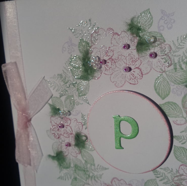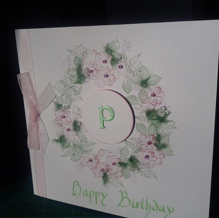 A completely handmade and unique designed card. Consisting of pristine quality white card which has a circle of dogroses and foliage handstamped and clear embossed. Embellished with toning glass beads and green mulberry paper. Finished off with pale pink organza ribbon and bow and Happy Birthday handwritten in green ink