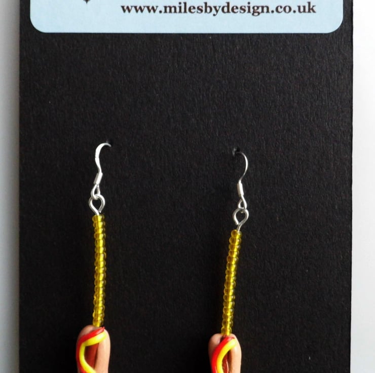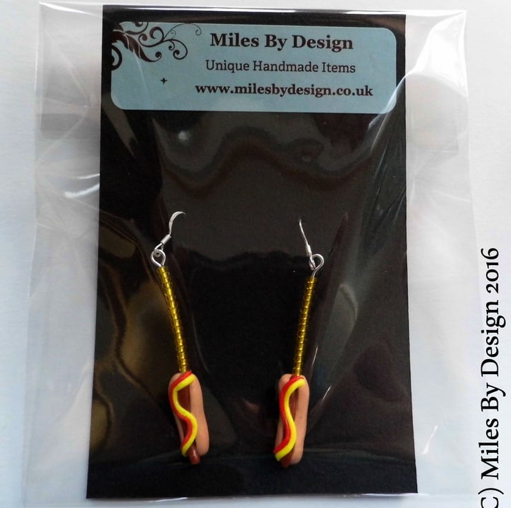 The hot dogs with mustard and ketchup toppings have been handcrafted from polymer clay, they are affixed to metal rods which have been covered by mustard coloured seed beads and to finish off attached onto sterling silver 925 ear hooks.