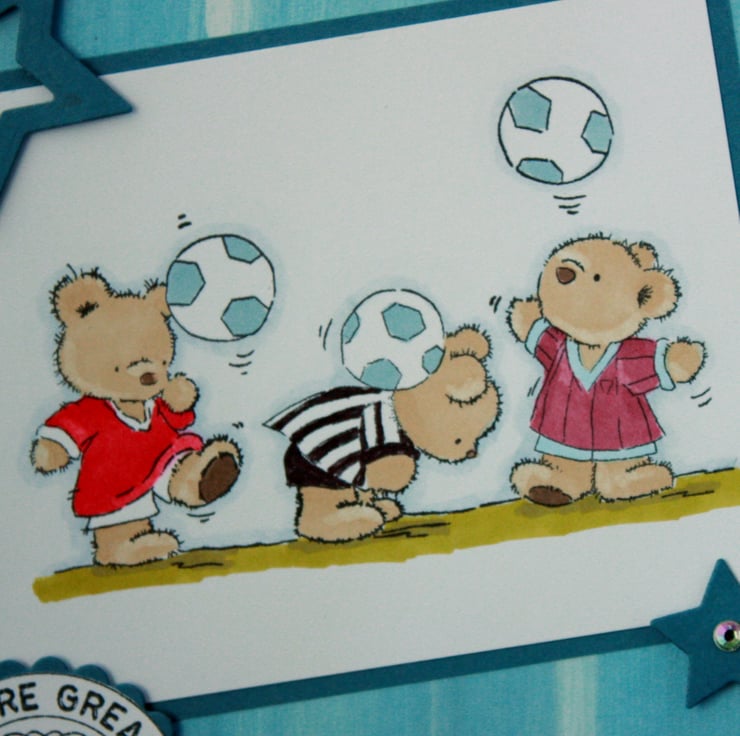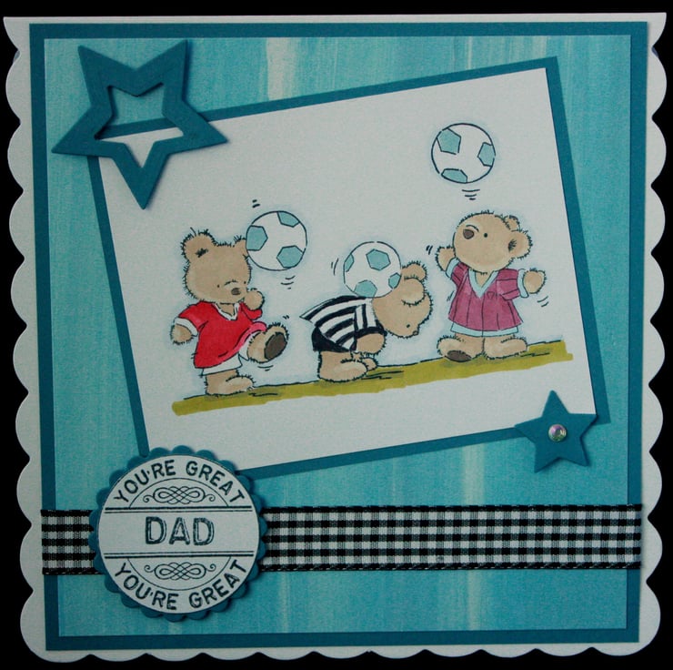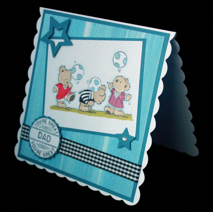 Square, scalloped card featuring a hand stamped and coloured image of three bears practising their football skills. The message 'You're Great Dad' has also been stamped and layered onto blue card, together with blue die cut stars and finished with a black and white check ribbon.