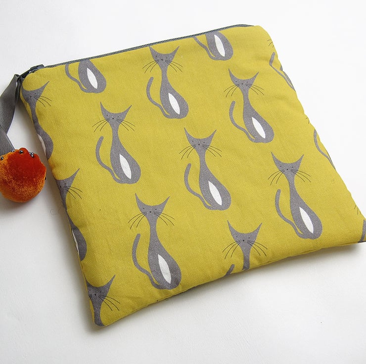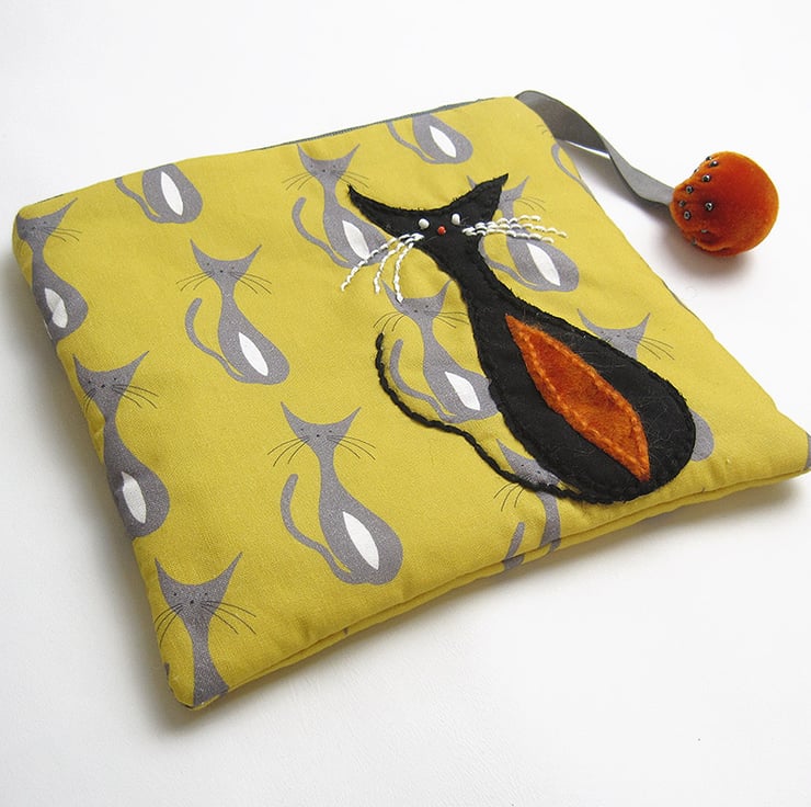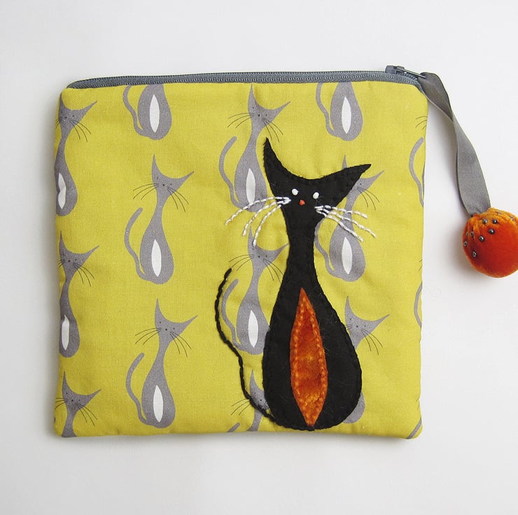 I have made this make up bag/pouch in my own mid century cats print design on cotton. The pouch also has an appliquéd cat on one side in black with orange velvet tummy and is lined in up cycled scarf fabric. I have also added an orange velvet zip pull with grey satin ribbon. The bag measures 17.5 cms(7 inches) width by 17.5(7 inches) cms depth.