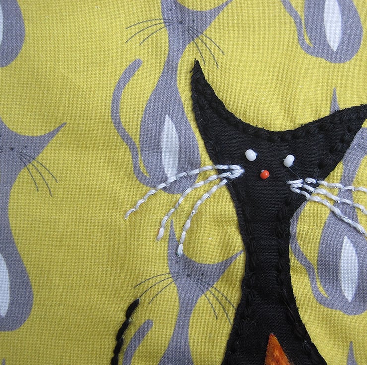 The inspiration for the bag was my interest in mid century ceramic cats and a current love of grey and mustard!