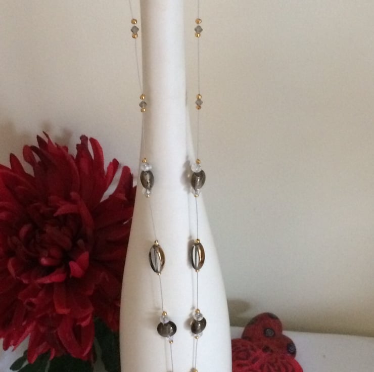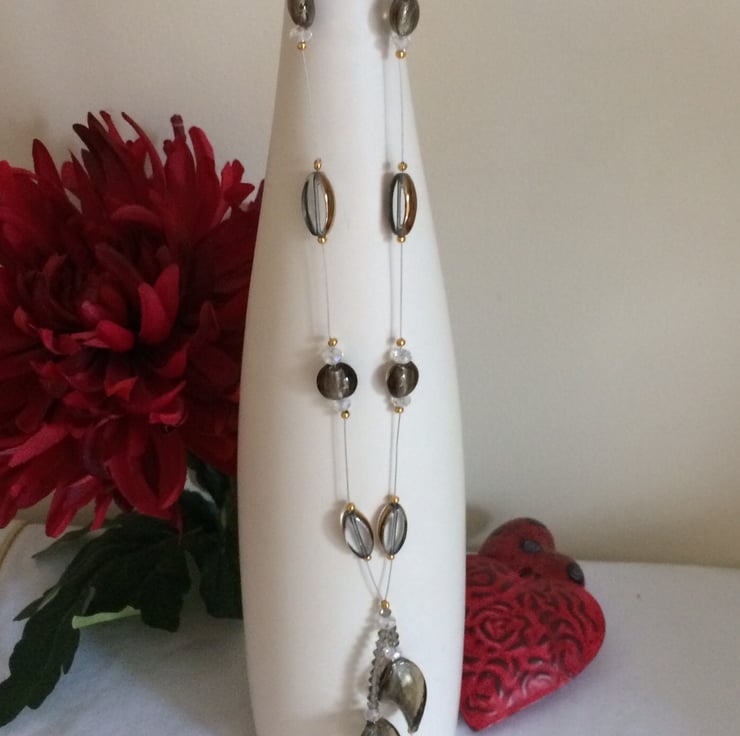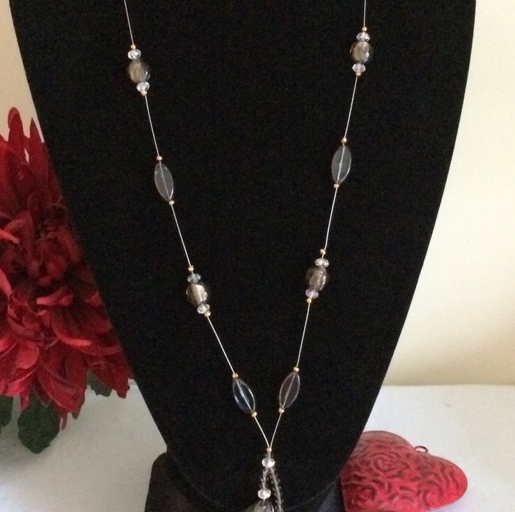 I have created this elegant necklace using a variety of beautiful beads. Smokey brown foil and smokey glass beads together with Czech clear crystal rondelle and smokey bicone beads to add a little bit of sparkle and gold plated crimp covers to complement the beads. This is a long necklace with no clasp, the necklace just pops on over your head.