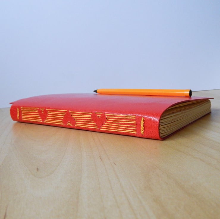 The book has been hand bound with golden yellow linen, in a longstitch pattern that I designed; the stitching is shaped to form three hearts along the length of the spine.
