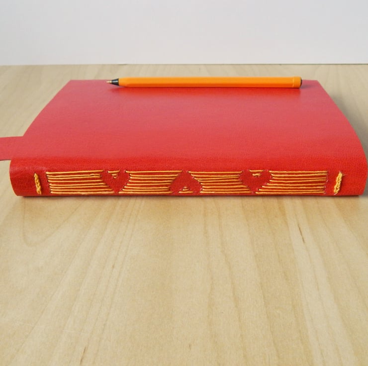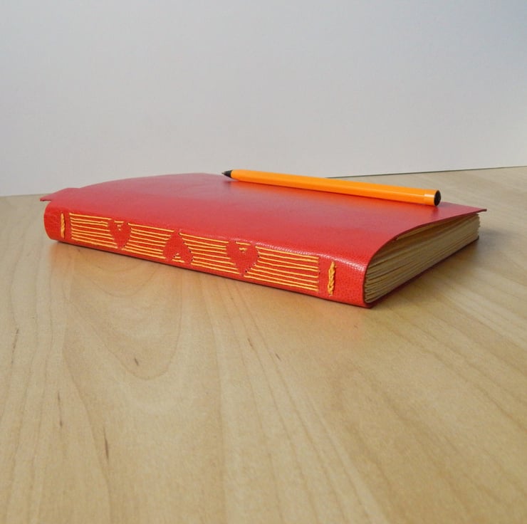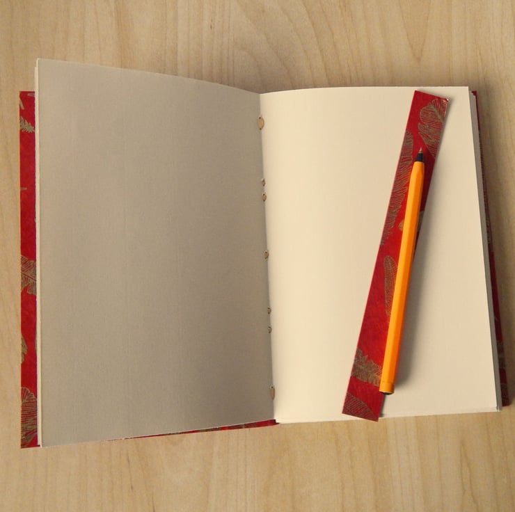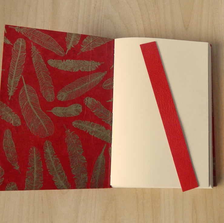 The leather is lined with mulberry paper, in a matching bright red colour, which has been printed with golden feathers, giving it a rich, luxurious appearance.