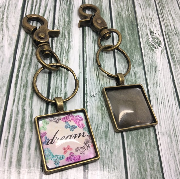 Square 25mm Setting, glass cabochon and Keyring clip in antique bronze.
