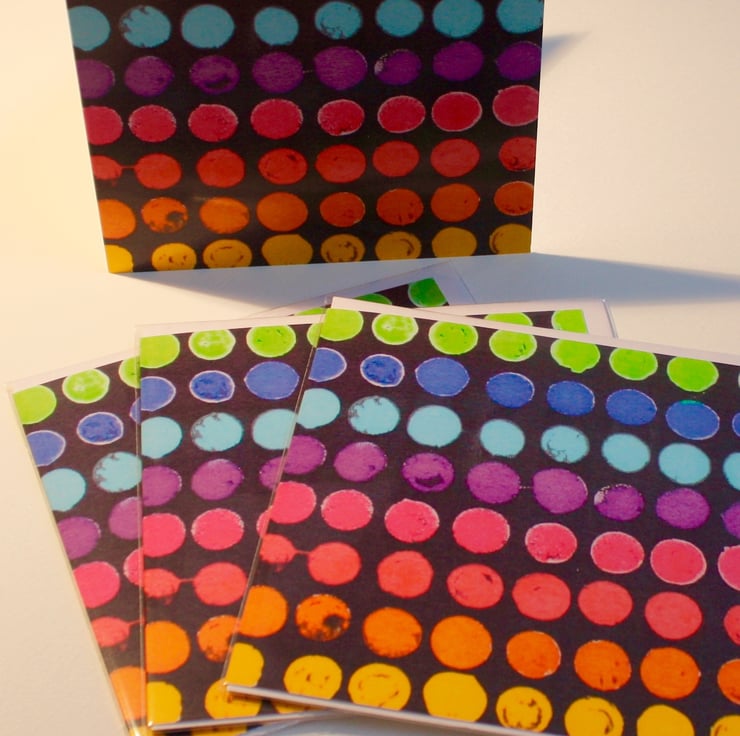 This striking card is a reproduction of a silk screen mono print that I made by methodically printing on the screen with the end of a pencil! I love the fact that each dot is unique.