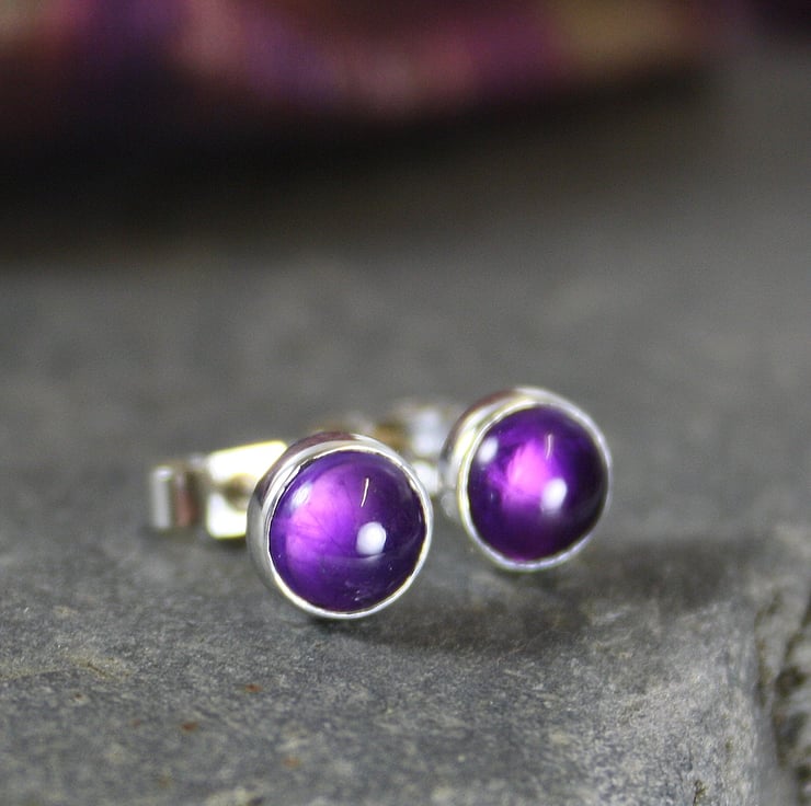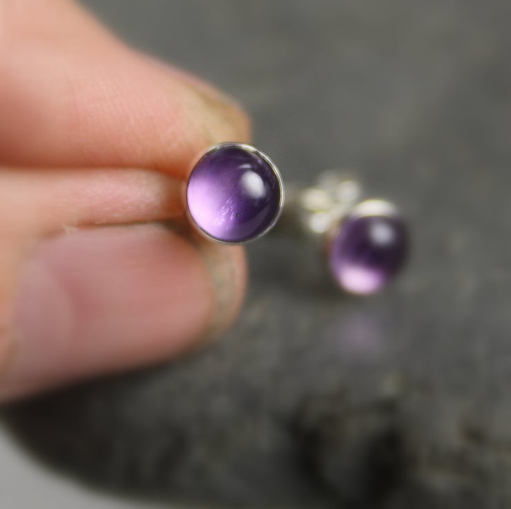 Simple handmade sterling silver stud earrings set with pretty deep purple amethyst cabochons.