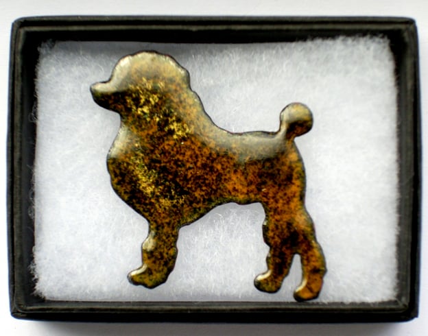The poodle measures 39mm wide by 35mm high at its widest points. It is mounted on a 26mm brooch bar; the pin secures with a rolling catch.