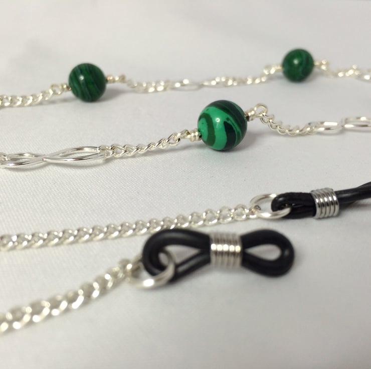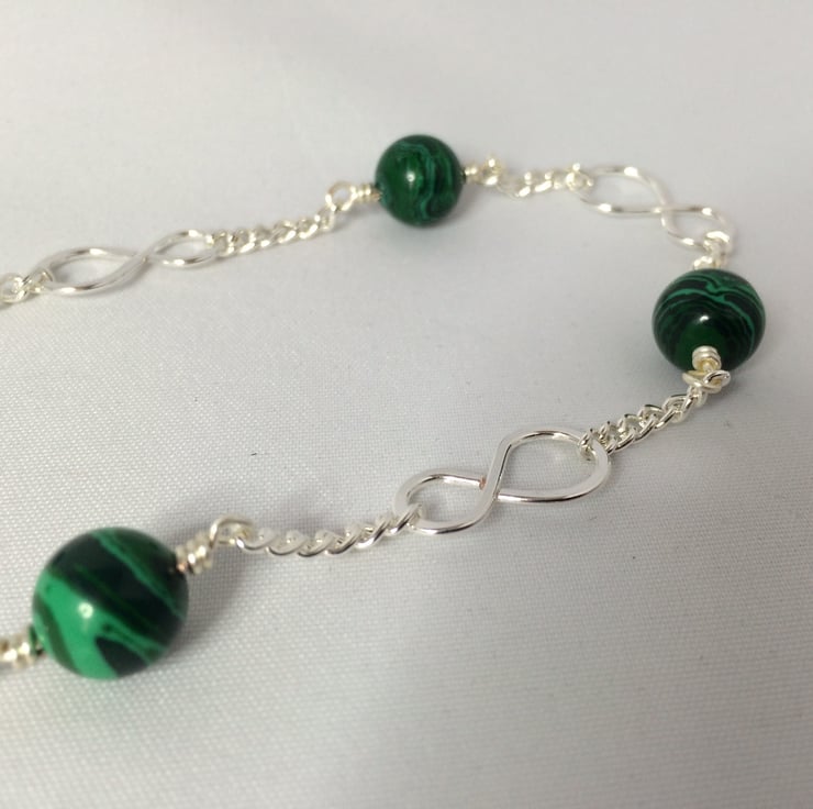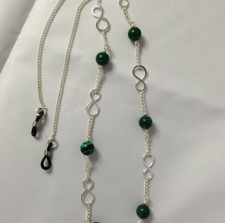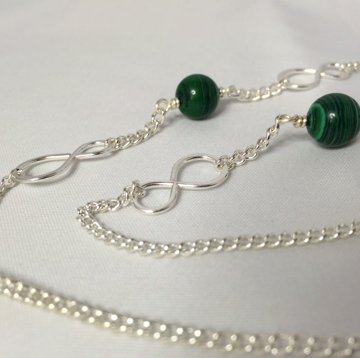 Malachite beads, silver plated infinity links and chain with rubber loop ends.