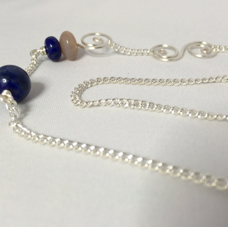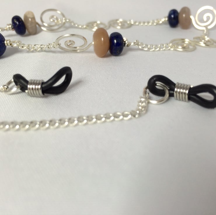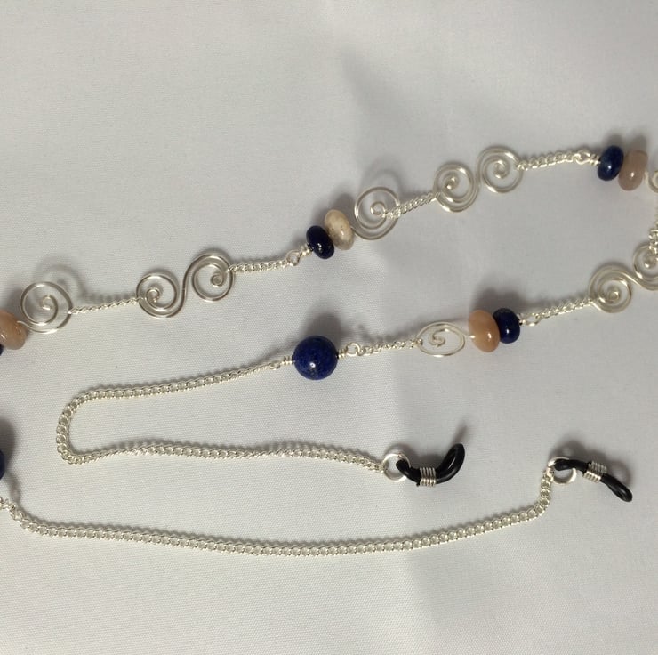 Sunstone, blue goldstone and lapis lazuli beads with silver plated wire, chain and rubber loop ends.