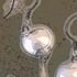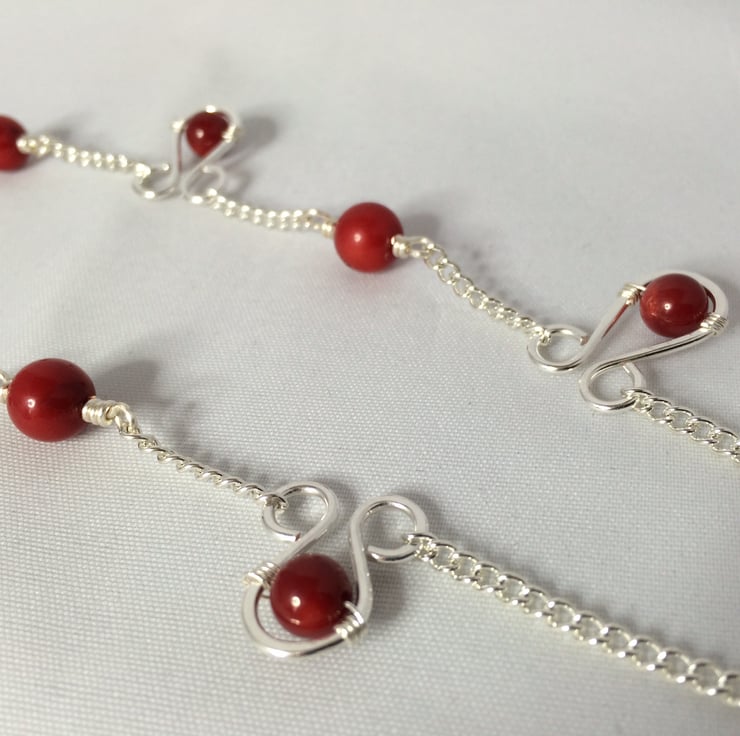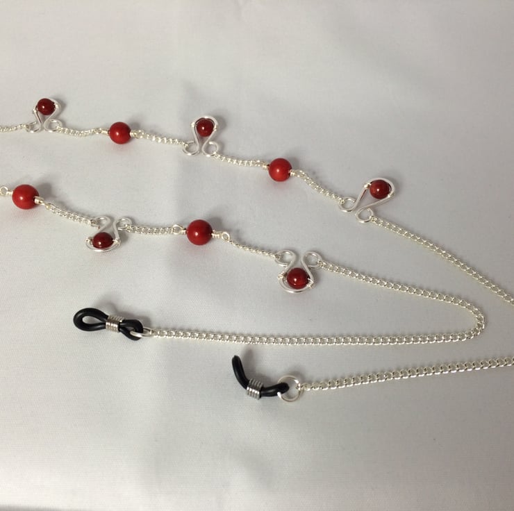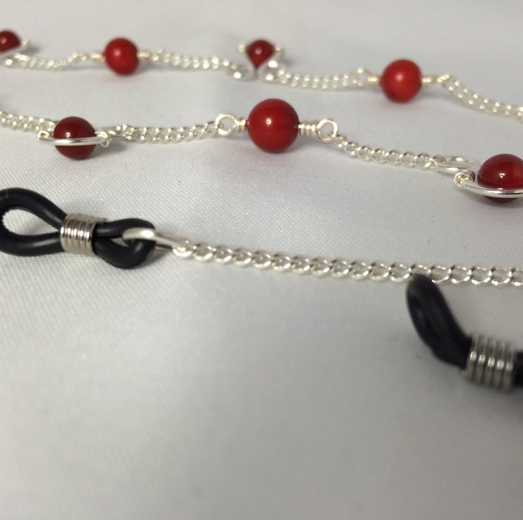 Red coral beads, silver plated wire and chain, and rubber loop ends.