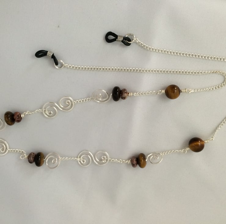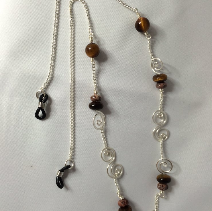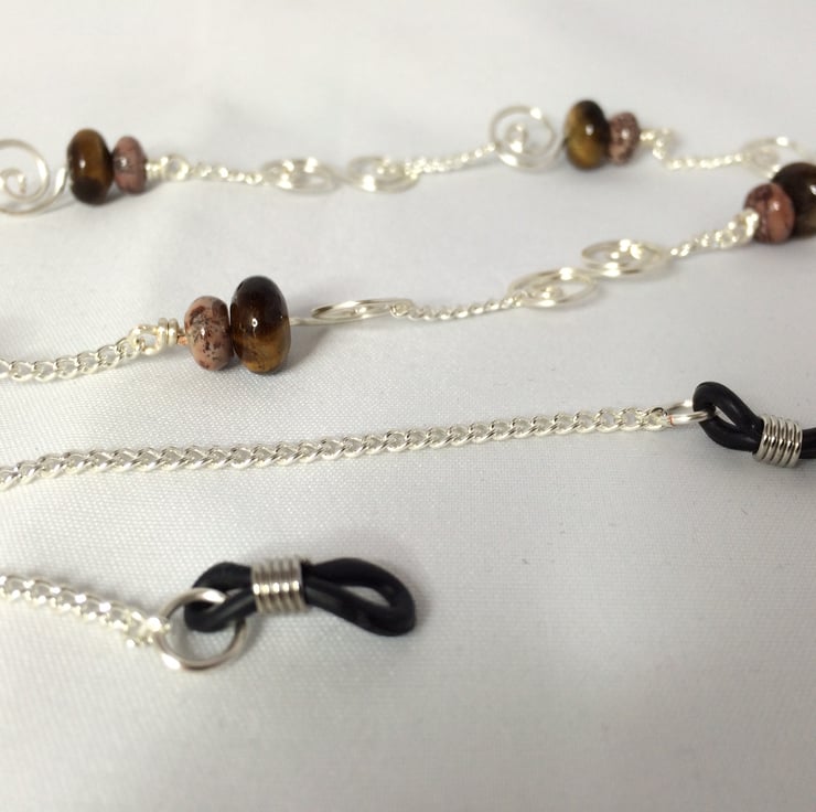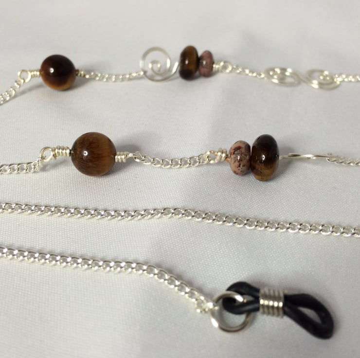 Tigers Eye and Unakite beads, silver plated chain and wire, and rubber end loops,