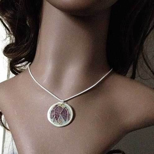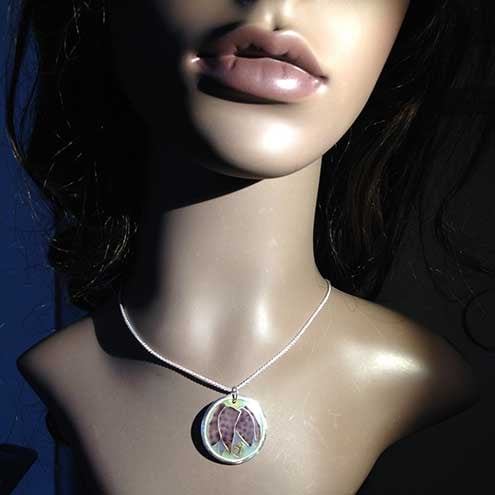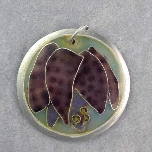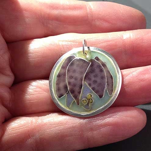 This lovely Spring flower has been captured in Cloisonne enamel work on fine silver and fired in my home kiln. The background is a lovely transparent blue like the sky in early Spring.The half closed umbrella shape of the Fritillary flower is speckled in Lavender and Purple tranparent enamels with the stamens picked out in a pale yellow opaque enamel hanging below the flower. The reverse side of the pendant has been enamelled in a glorious transparent celestial blue.