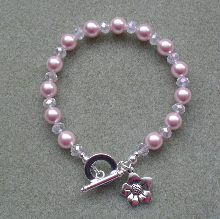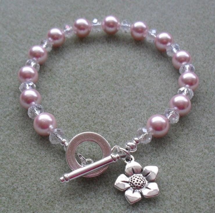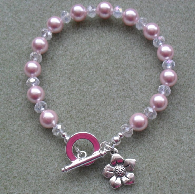 Round sell pearls in pale pink with crystal beads are beaded and attached to a silver plated toggle clasp. Bracelet also has a lovely silver plated flower charm.