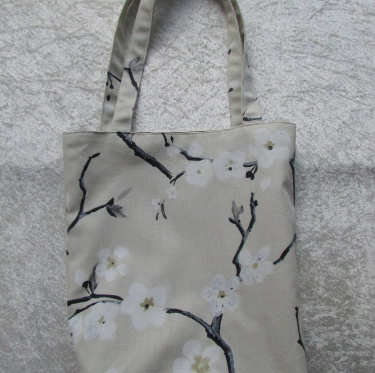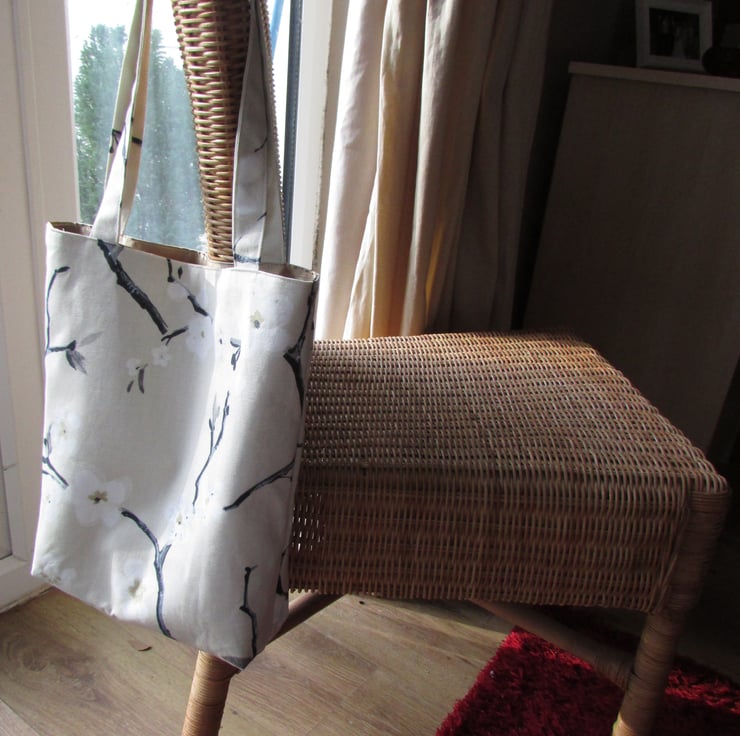I fell in love with this beautiful fabric with its delicate branches of pretty cherry blossom and combined it with a lovely co-ordinating gold lining to make this luxurious and pretty, yet practical and versatile tote bag.