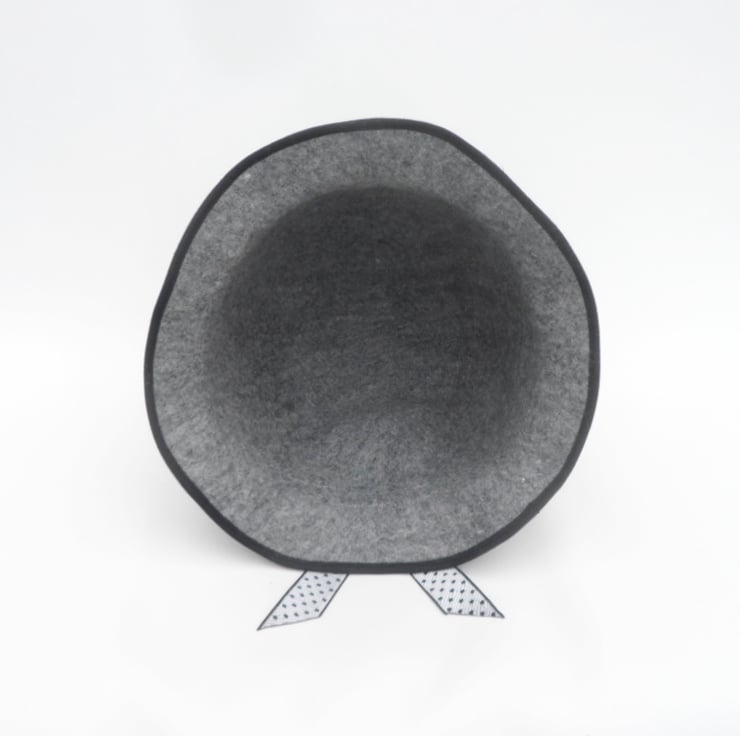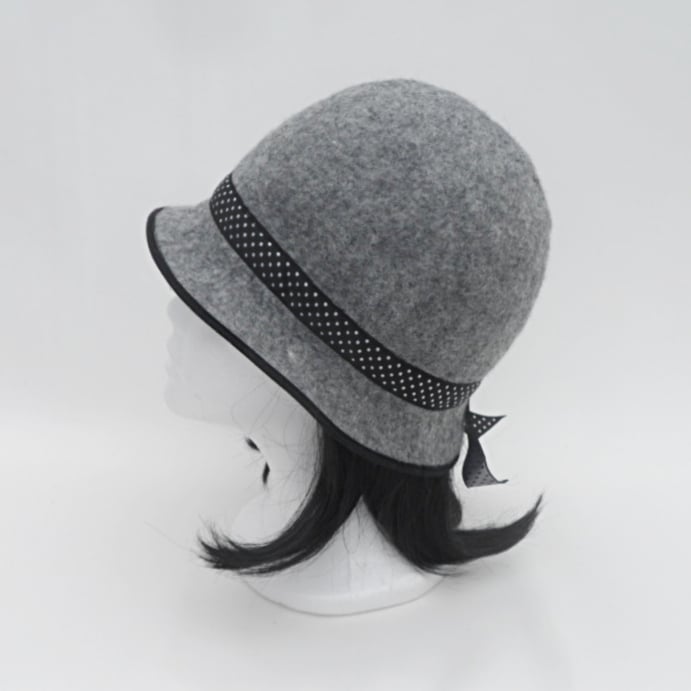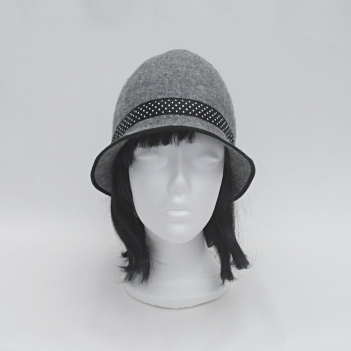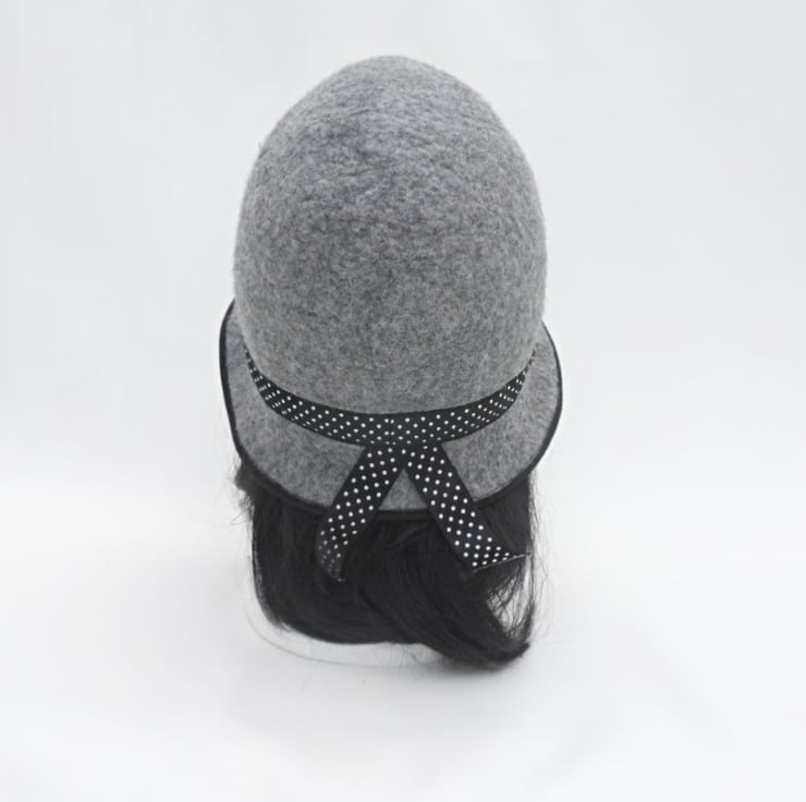 This cloche style hat has been made from hand felted natural grey merino wool. It is designed to sit low on the head in a 1920's style with the brim almost covering the eyes although the brim can be turned back if desired. A black and white polka dot ribbon has been added as a band around the hat and it has been edged using black bias binding.The resulting hat is super warm and snug. The hat has been made to fit a 22" (56cm) head.