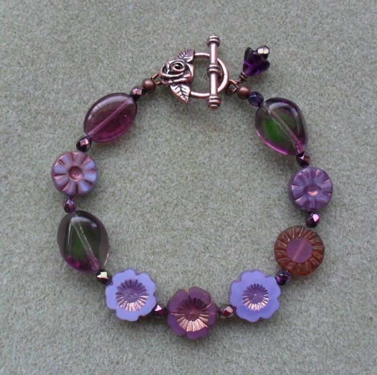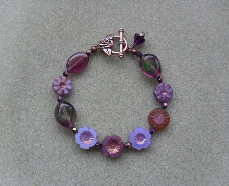 Czech glass beads in shades of purple are beaded and attached to a antique copper coloured toggle clasp.