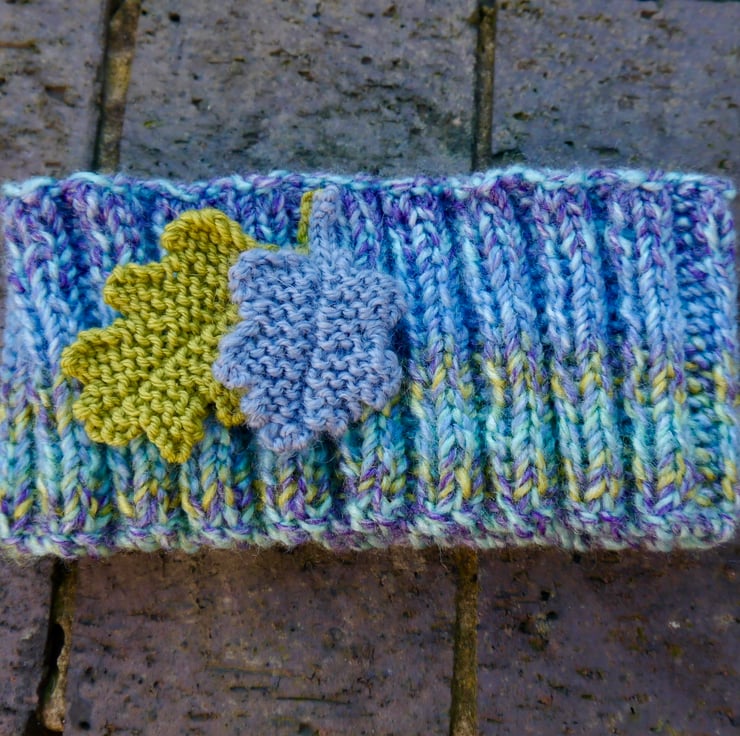 A lovely chunky ribbed headband hand knitted by me. I have attached two knitted oak leaves in complementary colours. Made with a marble effect good quality warm chunky yarn. I have knitted this on a circular needle so there are no seams. The ribbed effect means that it is very stretchy and will fit most head sizes, from child to adult. It measures approx. 9cm deep and is about 40cm around when not stretched.