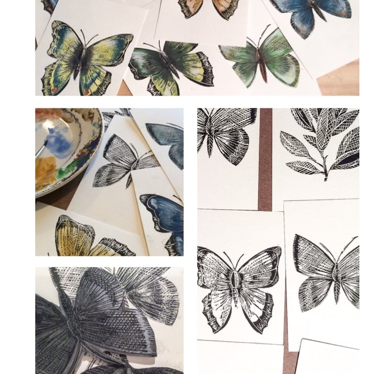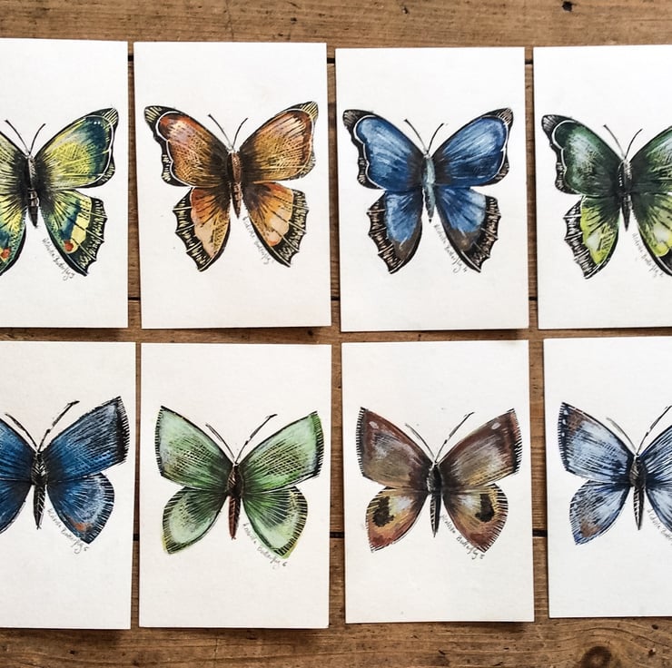 Part of a series of hand painted butterflies on water colour postcards. Each butterfly has been hand printed from Lino then individual coloured with water colour. Each butterfly is unique.