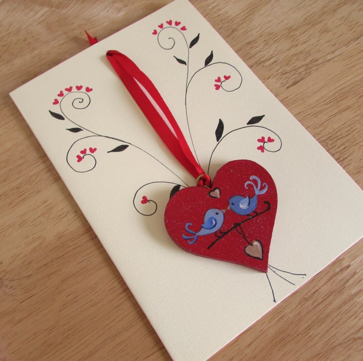 Handpainted Love Heart for Hanging anywhere you so desire. Attached to a Card so a Card & Gift in one. Card is blank inside for your own message.