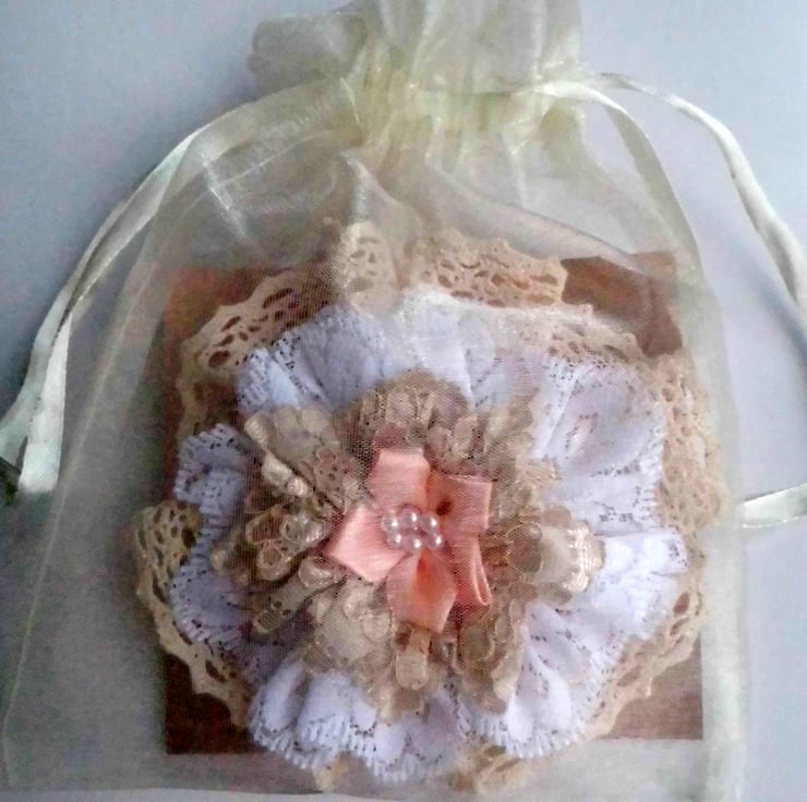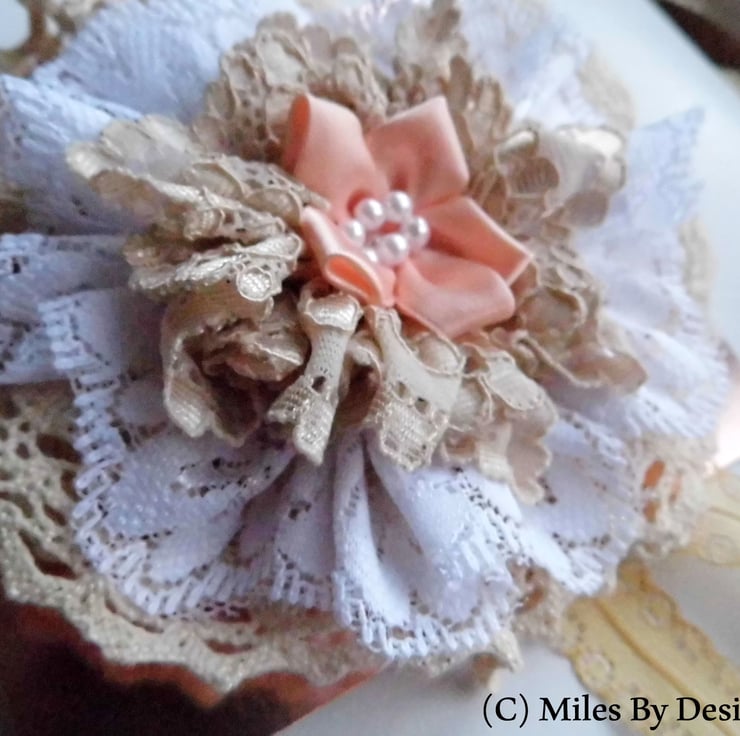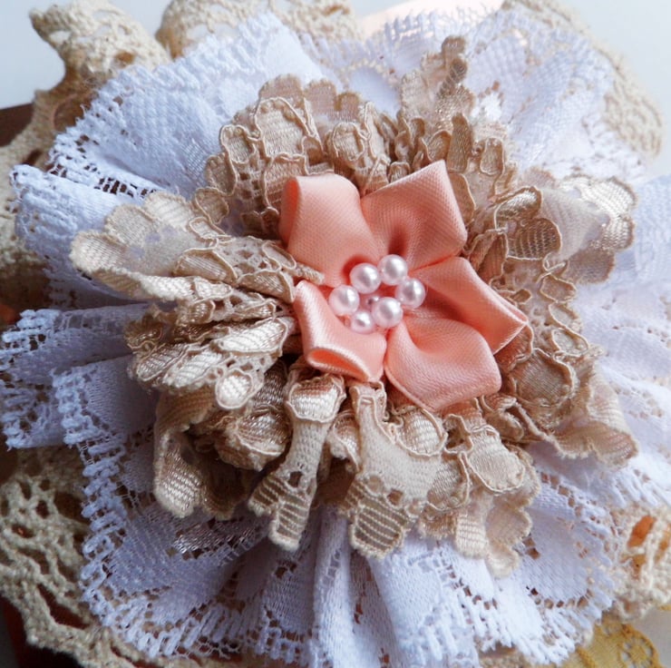 It is made from a beige cotton lace, white and coffee cream nylon lace & in the middle is a soft peach ribbon flower, with white plastic beads in the centre. It is finished off with antique coloured nylon lace tails.